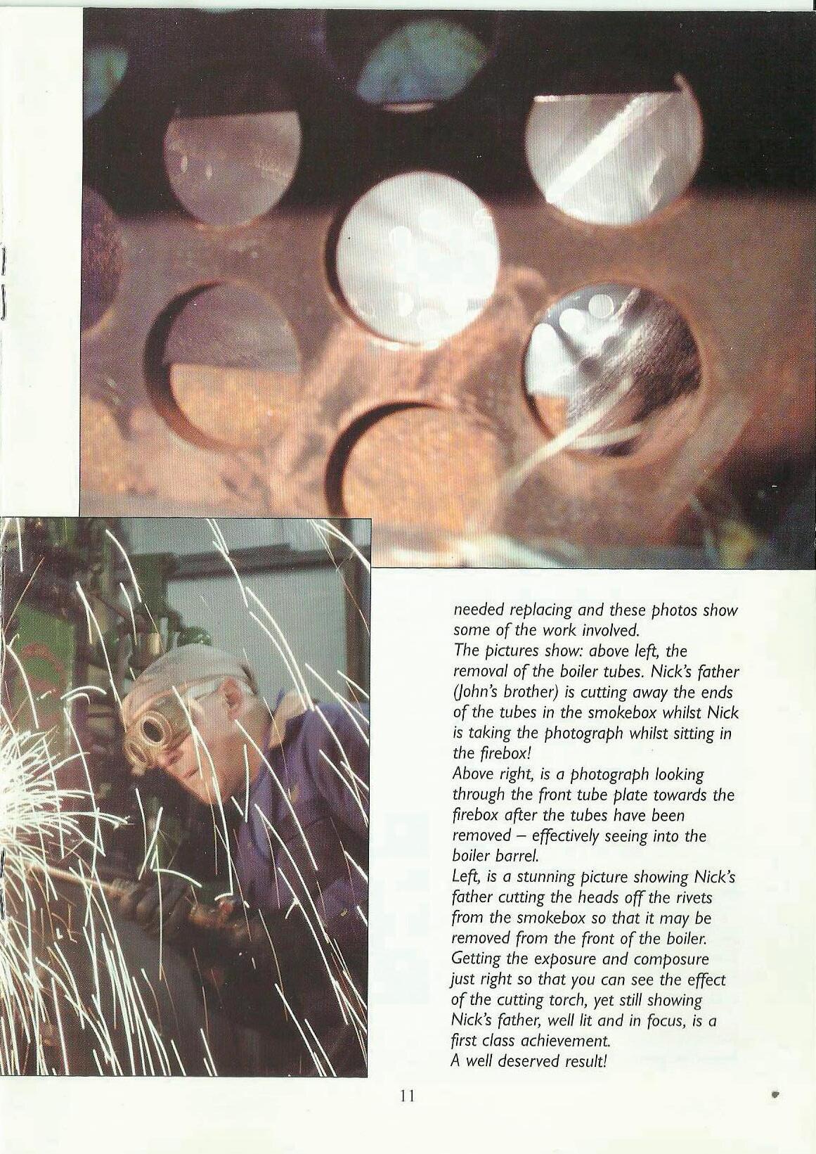 The pictures show: above left, the removal of the boilertubes. Nick's father ljohn's brother) is cutting away the ends of the tubes in the smokebox whilst Nick is taking the photograph whilstsitting in the firebox!