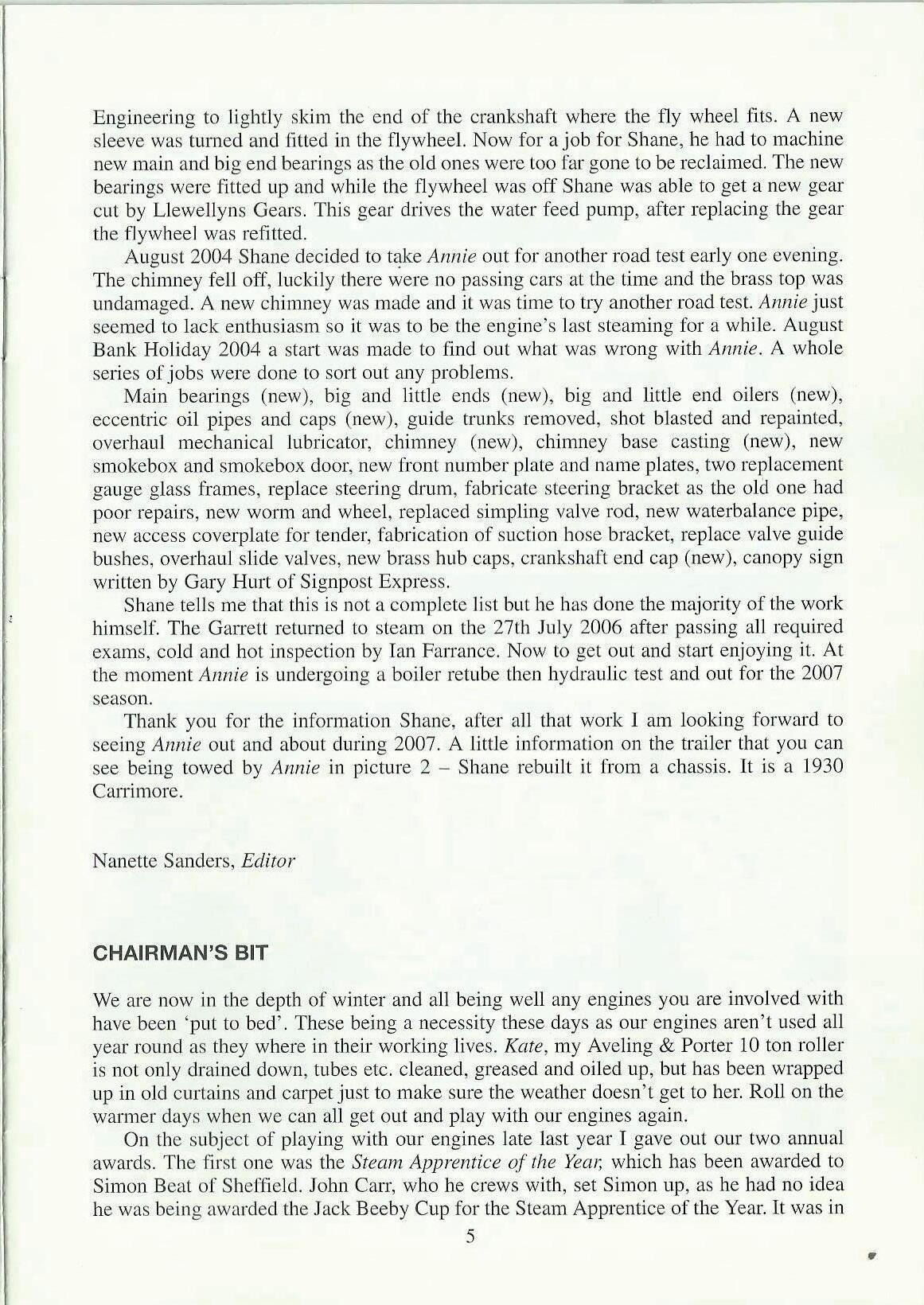 Shane tells me that this is not a complete list but he has done the majority of the work himself. The Garrett returned to steam on the 27th July 2006 after passing all required exams, cold and hot inspection by Ian Fa1nmce. Now to get out and start enjoying it. At the moment Annie is undergoing a boiler retube then hydraulic test and out for the 2007 season.