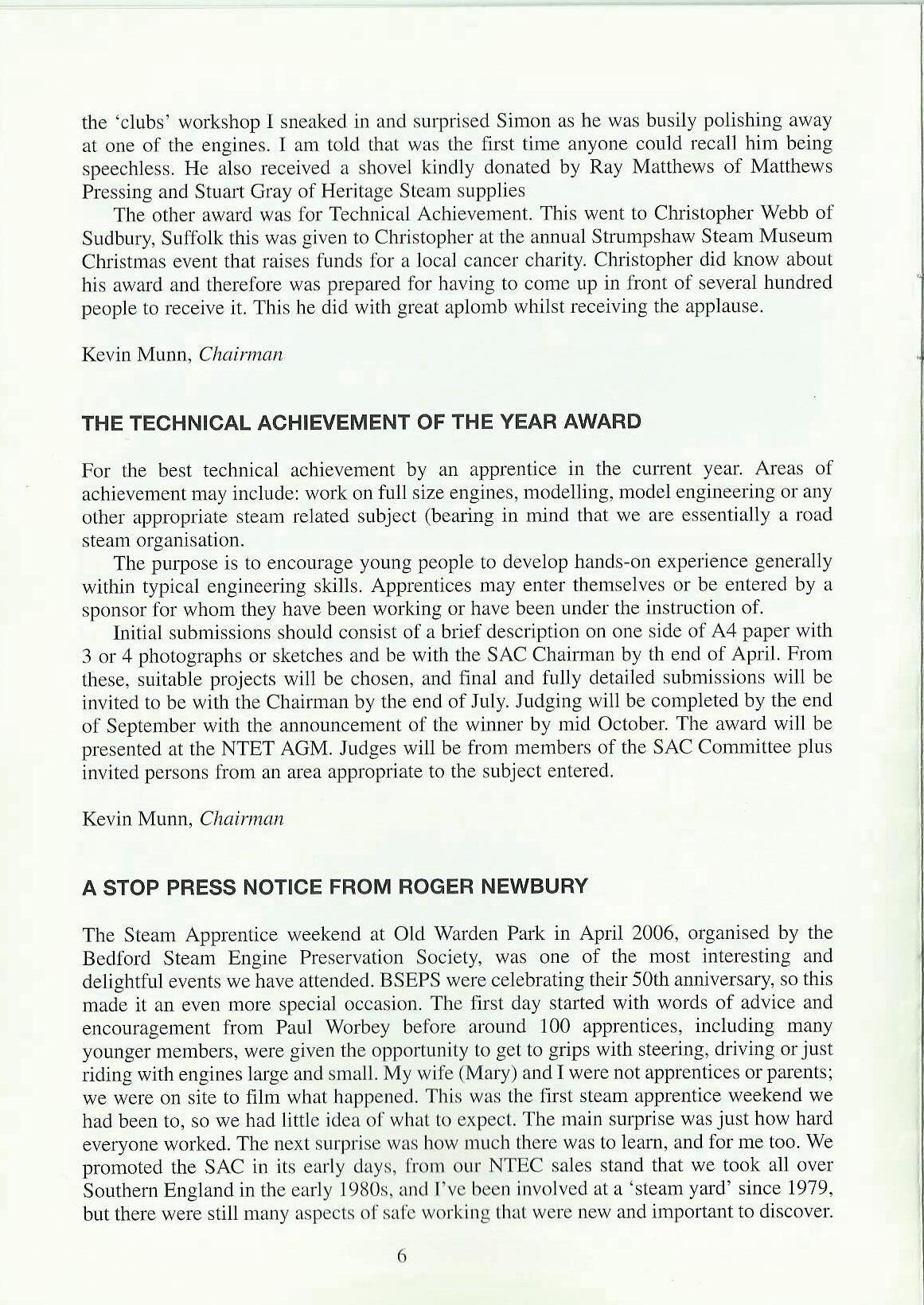 The other award was for Technical Achievement. This went to Christopher Webb of Sudbury, Suffolk this was given to Christopher at the annual Strumpshaw Stearn Museum Christmas event that raises funds for a loca] cancer charity. Christopher did know about his award and therefore was prepm·ed for having to come up in front of several hundred people to receive it. This he did with great aplomb whilst receiving the applause.