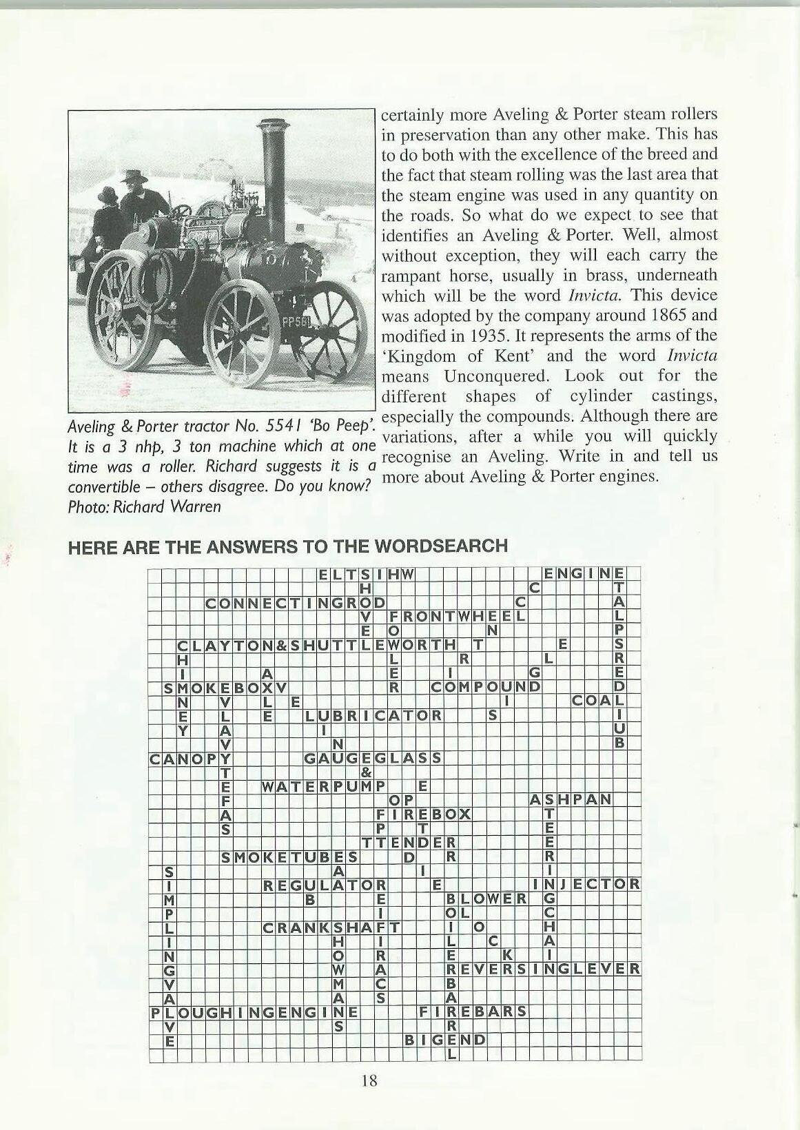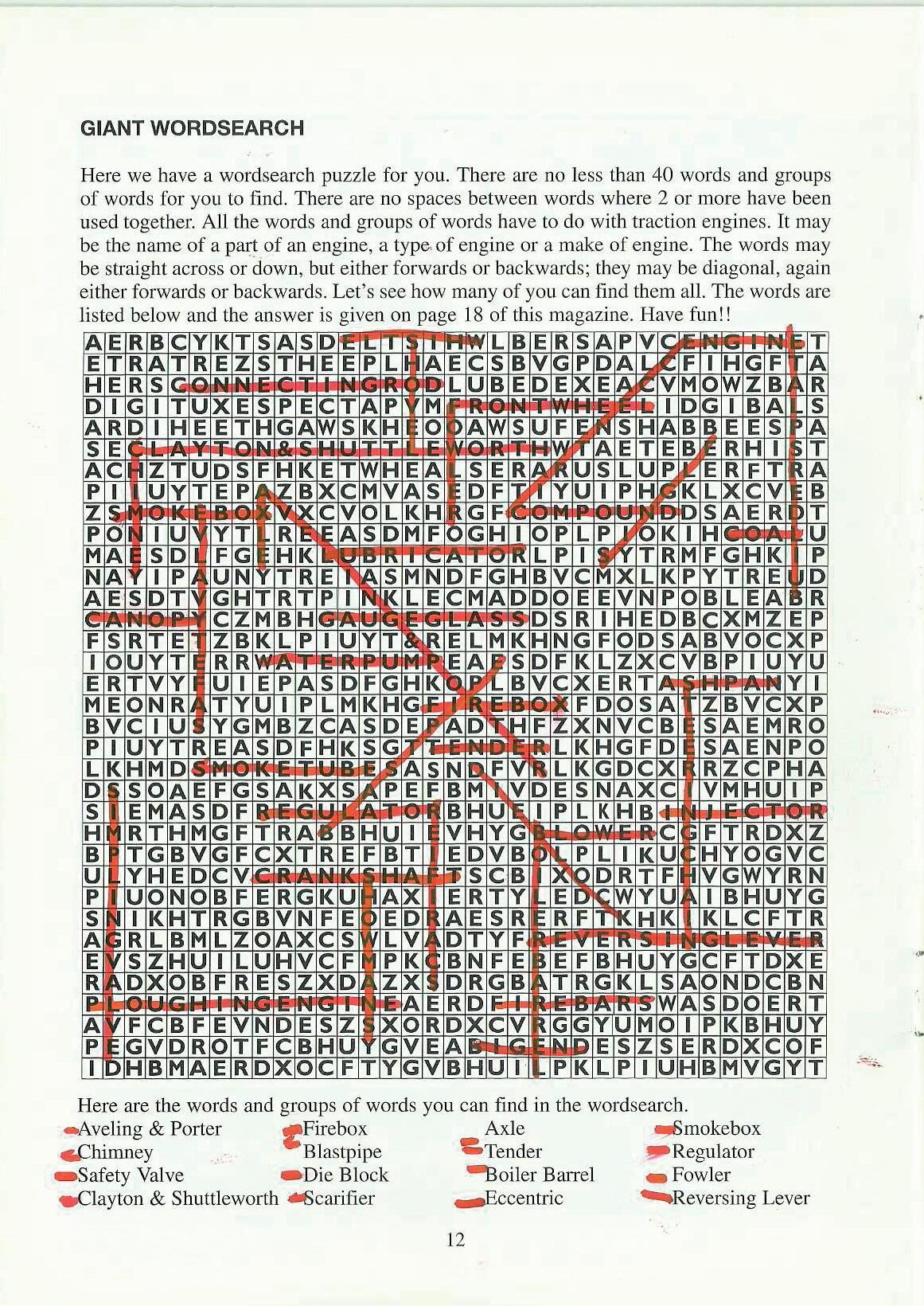 Here we have a wordsearch puzzle for you. There are no less than 40 words and groups of words for you to find. There are no spaces between words where 2 or more have been used together. All the words and groups of words have to do with traction engines. It may be the name of a par~ of an engine, a type, of engine or a make of engine. The words may be straight across or down, but either forwards or backwards; they may be diagonal, again either forwards or backwards. Let's see how many of you can find them all. The words are listed below and the answer is given on page I 8 of this magazine. Have fun!!