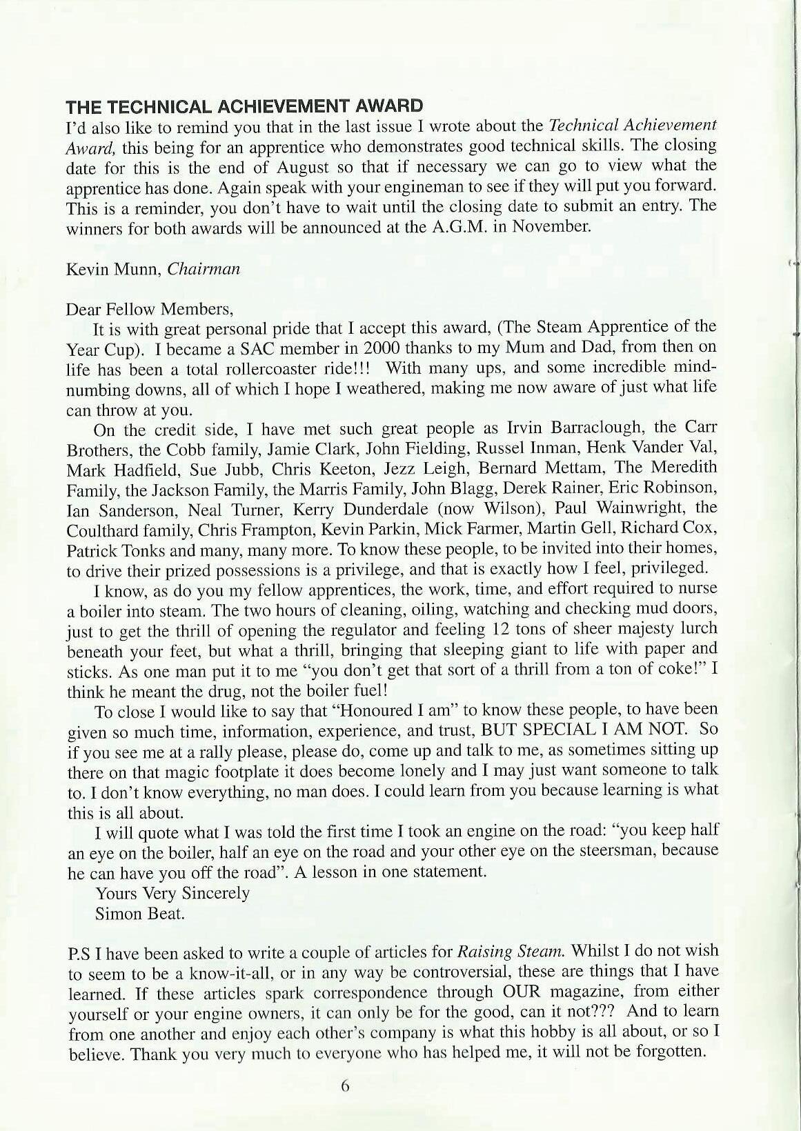I'd also like to remind you that in the last issue I wrote about the Technical Achievern.ent Award, this being for an apprentice who demonstrates good technical skiUs. The closing date for this is the end of August so that if necessary we can go to view what the apprentice has done. Again speak with your engineman to see if they will put you forward. This is a reminder, you don't have to wait until the closing date to submit an entry. The winners for both awards will be announced at the A.G.M. in November.