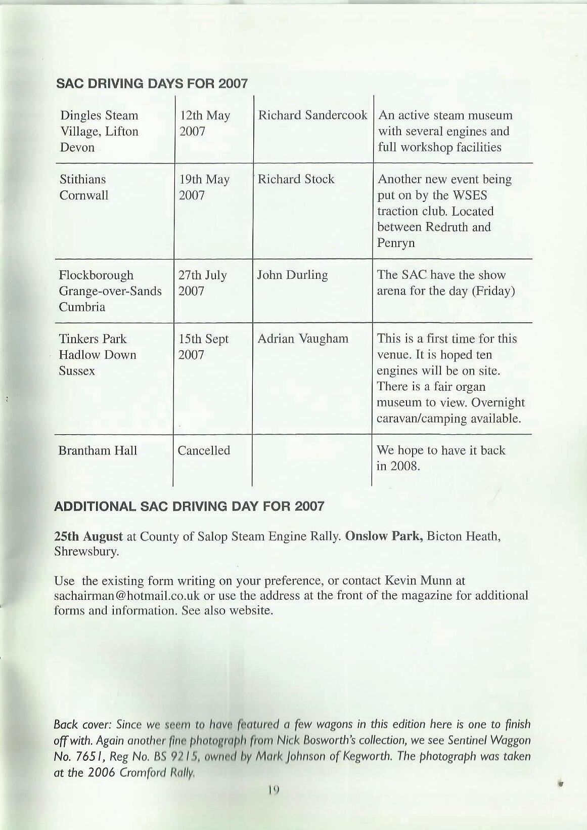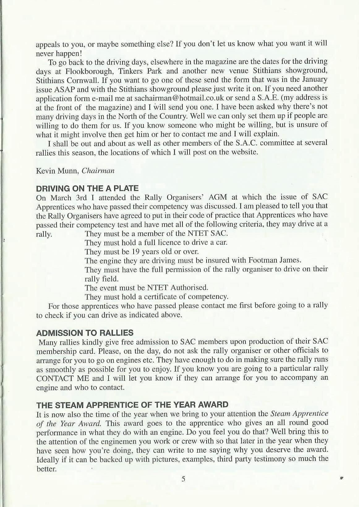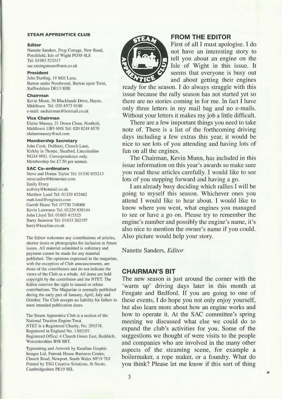 The new season is just around the corner with the 'warm up' dtiving days later in this month at Fengate and Bedford. If you are going to one of these events, I do hope you not only enjoy yourself, but also learn more about how an engine works and how to operate it. At the SAC committee's spring meeting we discussed what else we could do to expand the club's activities for you. Some of the suggestions we thought of were visits to the people and companies who are involved in the many other aspects of the steaming scene, for example a boilermaker, a rope maker, or a foundry. What do you think? Please let me know if this sort of thing