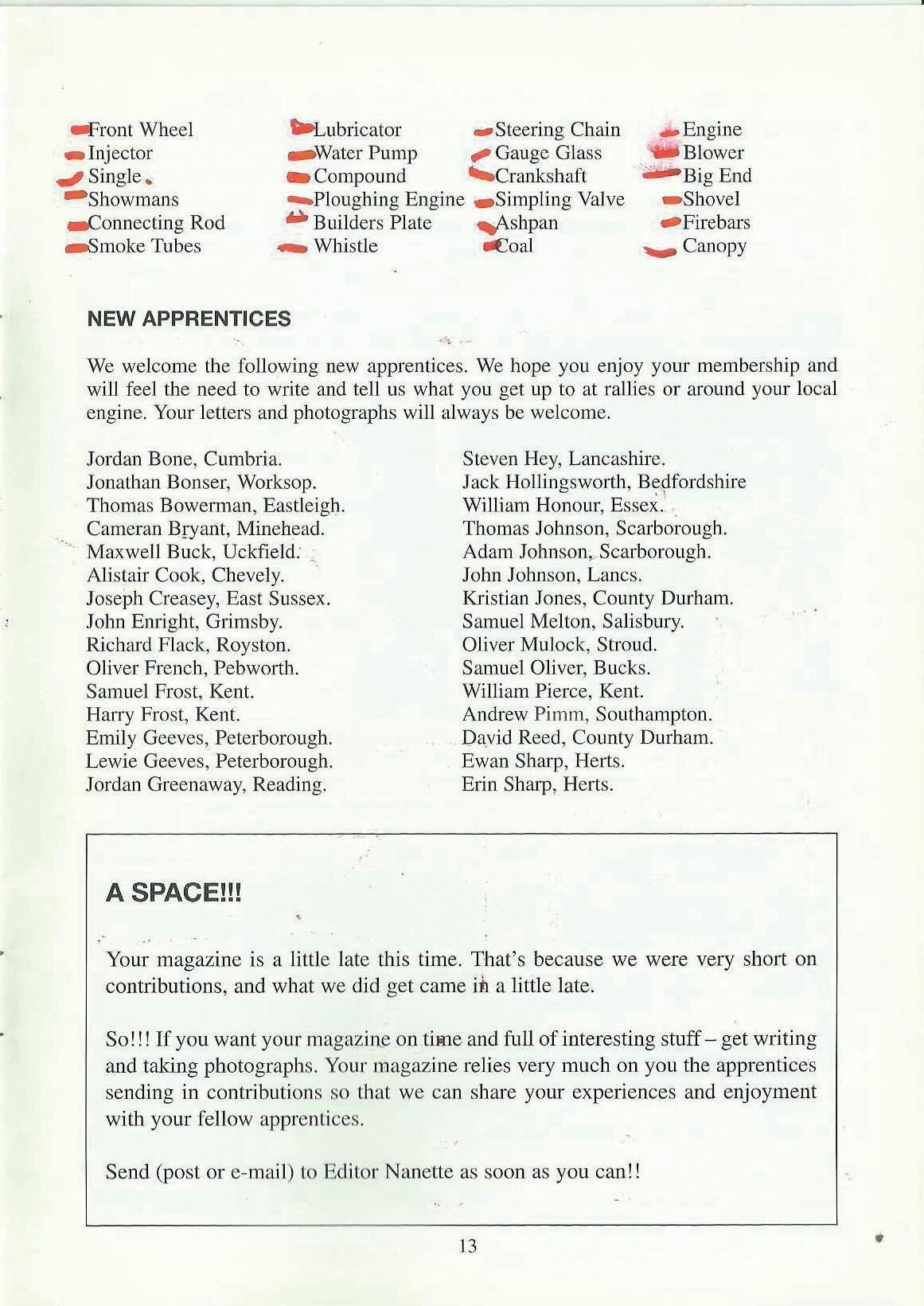 We welcome the following new apprentices. We hope you enjoy your membership and will feel the need to write and tell us what you get up to at rallies or around your local engine. Your letters and photographs will always be welcome.