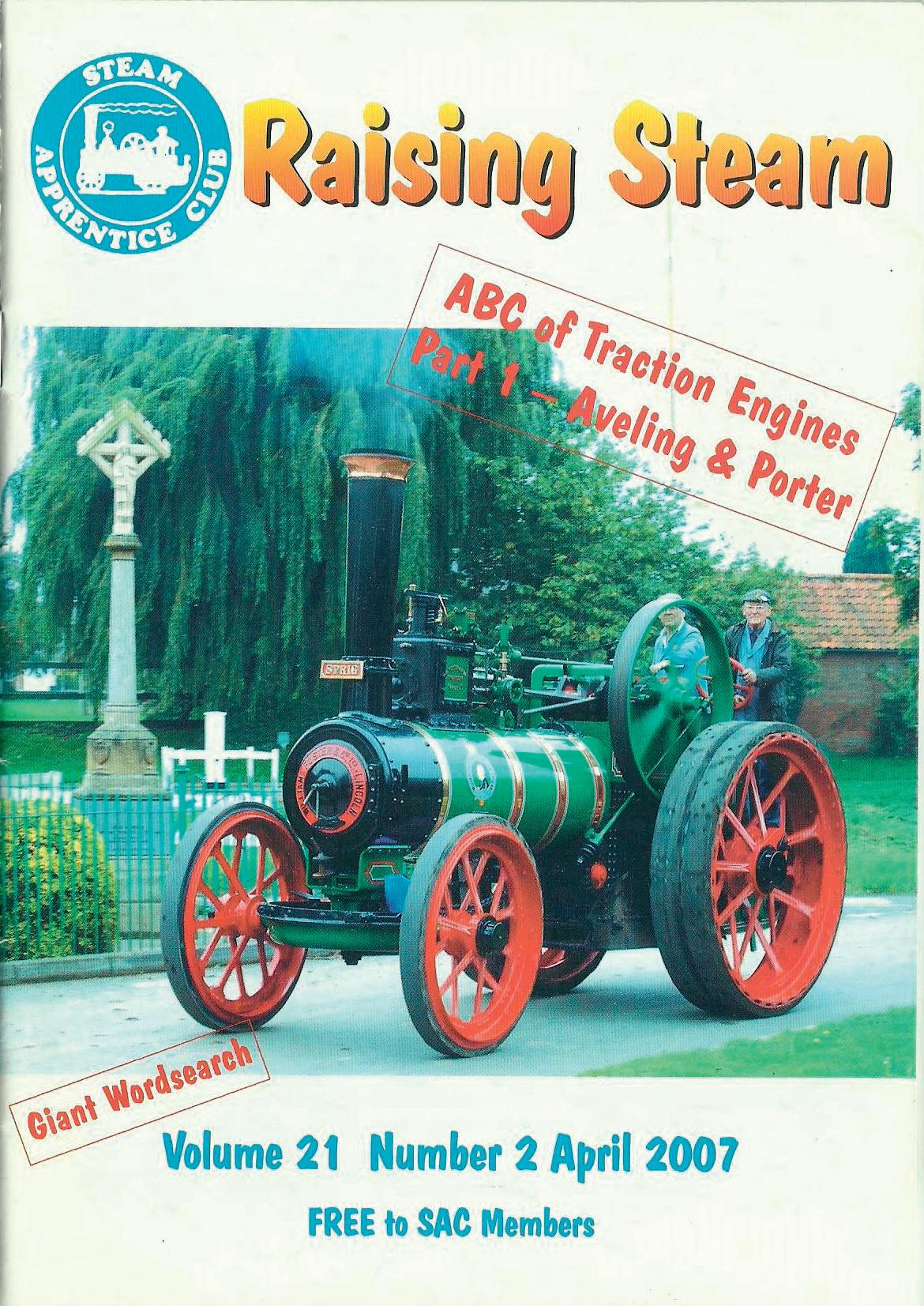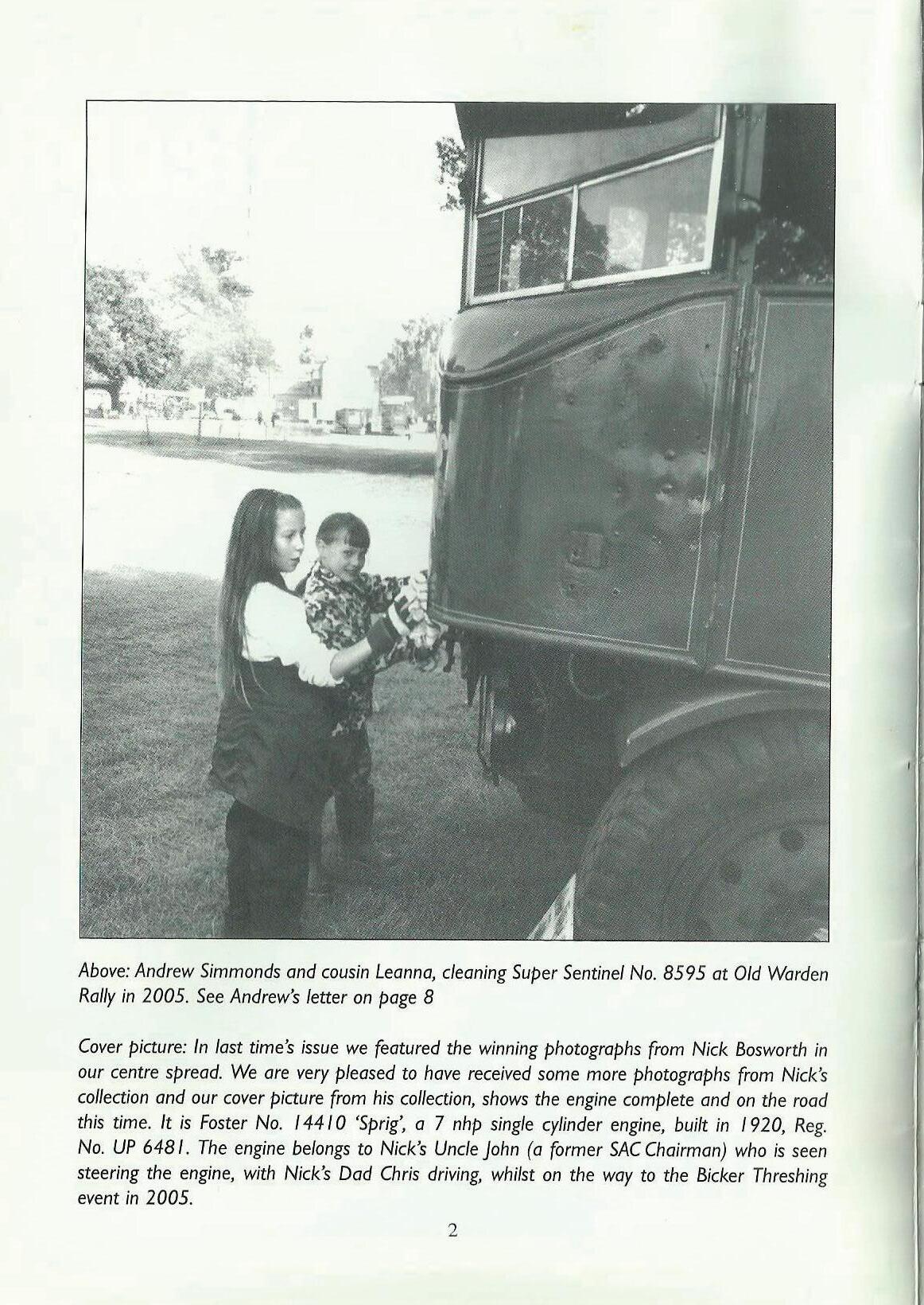 Cover picture: In last time's issue we featured the winning photographs from Nick Bosworth in our centre spread. We are very pleased to have receivedsome more photographs from Nick's collection and our cover picture from his collection,showsthe engine complete and on the road this time. It is Foster No. 14410 'Sprig', a 7 nhp single cylinder engine, built in I 920, Reg. No. UP 6481. The engine belongs to Nick's UncleJohn (a former SACChairman) who is seen steering the engine, with Nick's Dad Chris driving, whilst on the way to the Bicker Threshing event in 2 005.