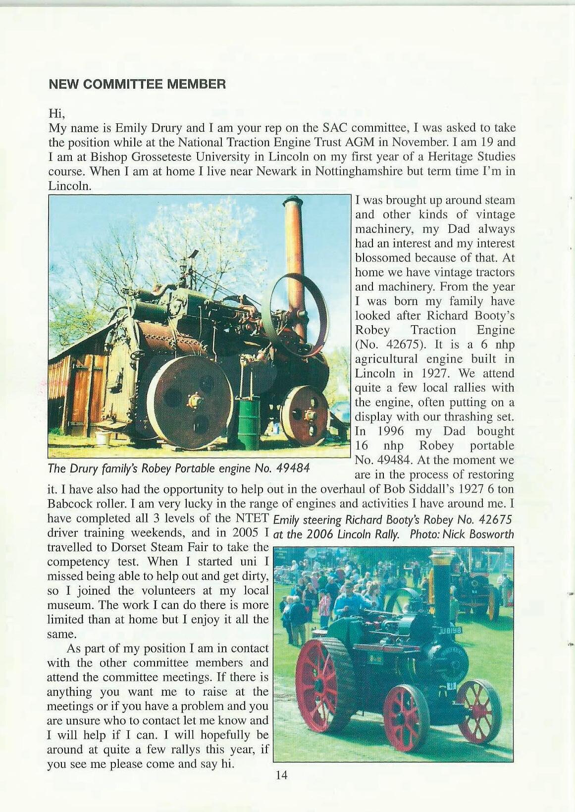 My name is Emily Drury and I am your rep on the SAC committee, I was asked to take the position while at the National Traction Engine Trust AGM in November. I am 19 and l am at Bishop Grosseteste University in Lincoln on my first year of a He1itage Studies course. When I am at home I live near Newark in Nottinghamshire but term time I'm in Lincoln. . i