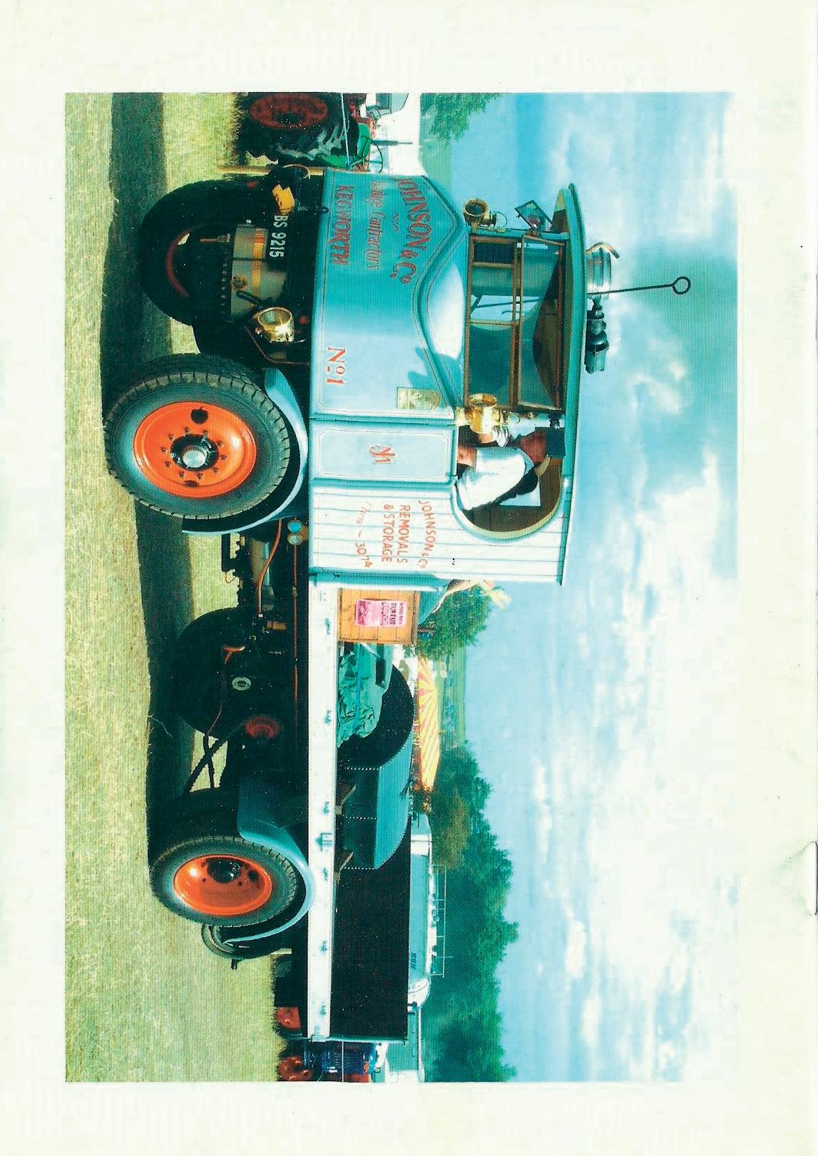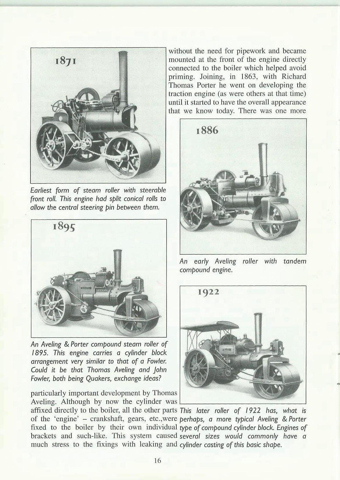One of the most important of his developments was what we now call a steam roller. In 1865 he equipped an engine with very wide driving wheels, which towed another very ,---------------------------. heavy roller to take up the gap between the main wheels . ..f!II. This was the beginning of the steam roller. By 1871 he had developed the early form of front fork whereby the 'middle' roller moved to the front of the engine and was \(•' ~Jr.14 steerable. So great was his reputation as an engineer and particularly his development works that he became known as 'Father of the Traction Engine'. So now I hope you can understand why we have accorded the first article to '---------~-"-------=--------