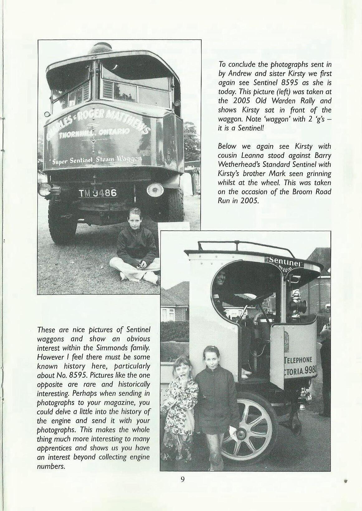 To concludethe photographssent in by Andrew and sister Kirsty we first again see Sentinel 8595 as she is today.Thispicture(le~)was taken at the 2005 Old Warden Rafly and shows Kirsty sat in front of the waggon.Note 'waggon'with 2 'g'sit is a Sentinel!
