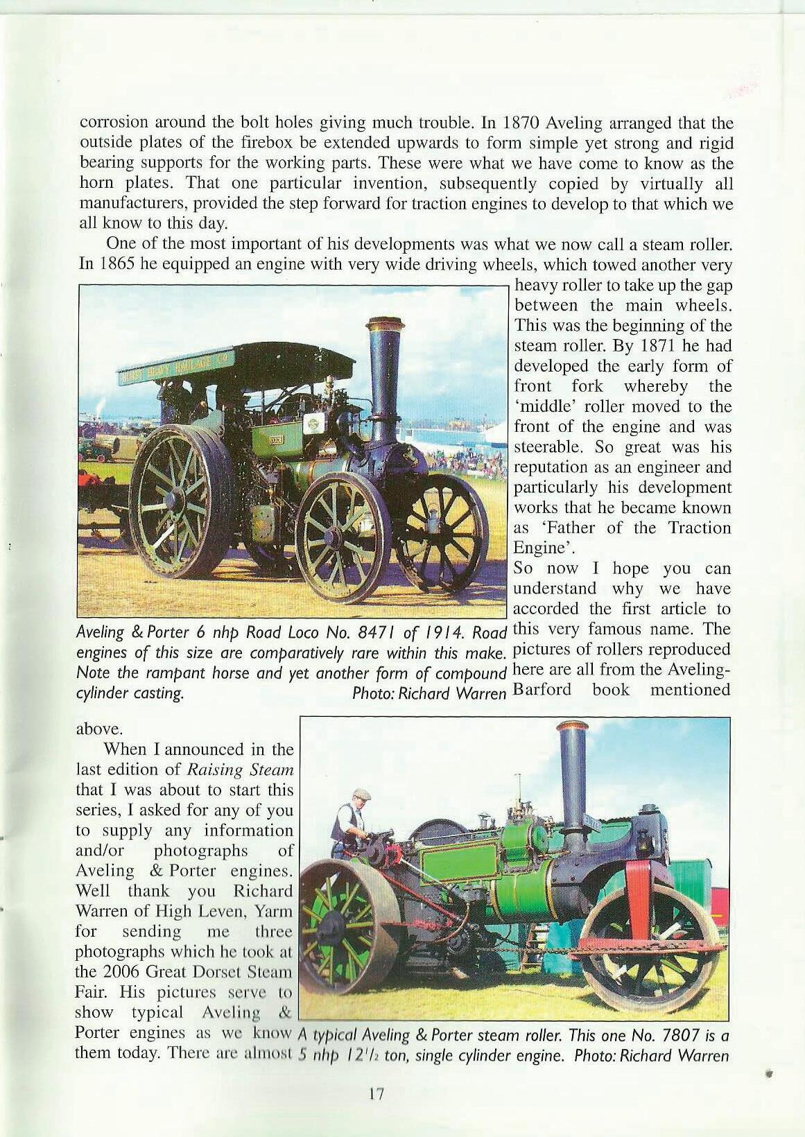When I announced in the last edition of Raising Steam that I was about to start this se1ies, I asked for any of you to supply any information and/or photographs of Aveling & Porter engines. Well thank you Richard Warren of High Leven, Yarm for sending me three photographs which he look at the 2006 Great Dorset Steam Fair. His pictures serve I o show typical Ave Ii11g & Porter engines as we Jrnow A lyf)icalAveling & Porter steam roller.This one No. 7807 is a them today. There arc almost 5 11/1/J I 2 1h ton, single cylinder engine. Photo:Richard Warren