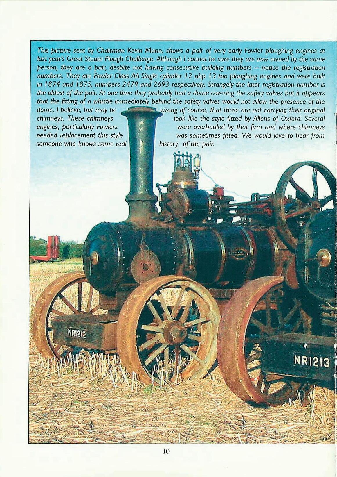 Thispietur:esent by Chairman~evin Munn, shows a pair of very early Fowlerploughingenginesat lastyear'sGreat Steam PloughChallenge.AlthoughI cannot be sure they are now owned by the same person, they are a pair, despite not havingconsecutivebuildingnumbers. notice the registration numbers. They are FowlerClassAA SinglecylinderI 2 nhp 13 ton ploughingengines and were built in 1874 and I 875, numbers 2479 and 2693 respectively.Strangelythe later registrationnumber is the oldestof the pair.At one time they probablyhad a dome coveringthe safety valvesbut it appears that the fittingof a whistleimmediatelybehind the safety valveswouldnot allowthe presence of the dome. I believe,but may be wrongof course,that these are not carryingtheir original chimneys.These chimneys look like the style fitted by A/lens of Oxford.Several engines,particularlyFowlers were overhauledby that firm and where chimneys needed replacementthis style was sometimes 'fitted.We would love to hear from someone who knows some real history of the pair.