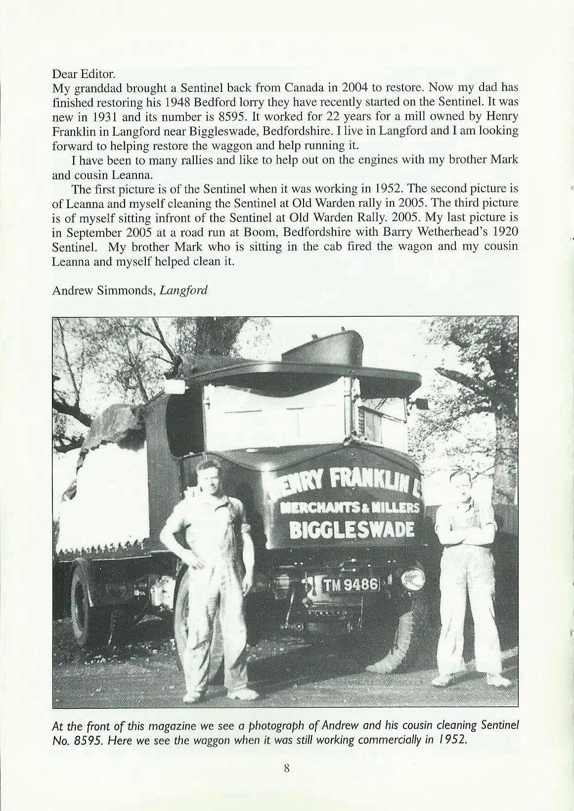 My granddad brought a Sentinel back from Canada in 2004 to restore. Now my dad has finished restoring his 1948 Bedford lorry they have recently started on the Sentine1. It was new in 1931 and its number is 8595. It worked for 22 years for a mill owned by Henry Franklin in Langford near Biggleswade, Bedfordshire. I live in Langford and 1 am looking forward to helping restore the waggon and help running it.