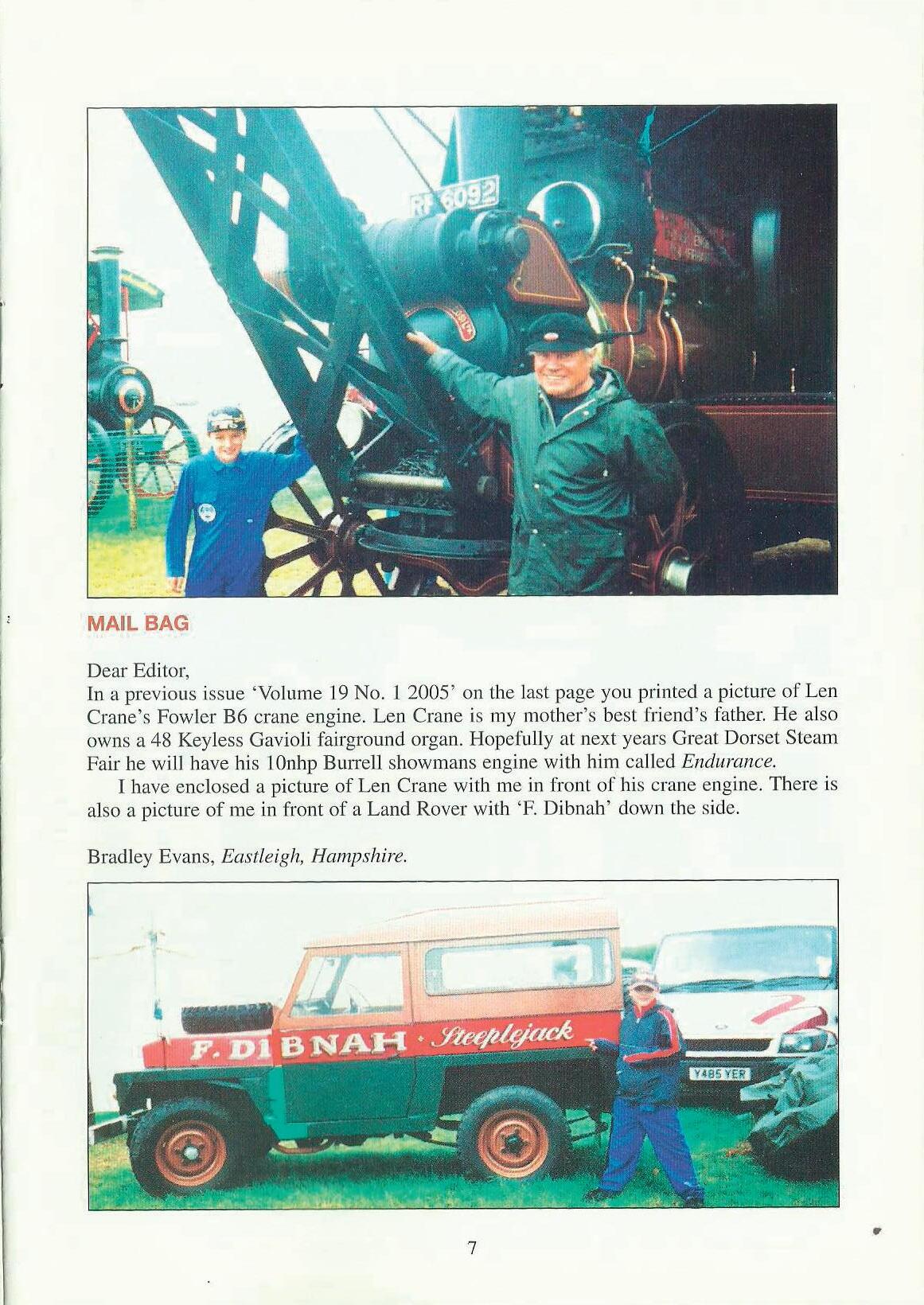 In a previous issue 'Volume 19 No. l 2005' on the last page you printed a picture of Len Crane's Fowler B6 crane engine. Len Crane is my mother's best friend's father. He also owns a 48 Keyless Gavioli fairground organ. Hopefully at next years Great Dorset Steam Fair he will have his 10nhp Burrell showmans engine with him called Endurance. I have enclosed a picture of Len Crane with me in front of his crane engine. There is also a picture of me in front of a Land Rover with 'F. Dibnah' down the side.