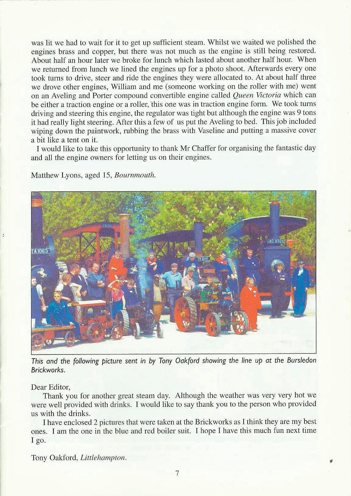 I am writing about my driving day at Bursledon Brickworks in Southampton. I wa.snervous about my clay but when I got there I was given my itinerary. I was placed with a man called Tony who had a 4'/z" BrnTell. The engine was called Oliver. In the morning I had to clean the engine and sweep the tubes which was fun. We had to light the engine and all move into a line for the photo call.