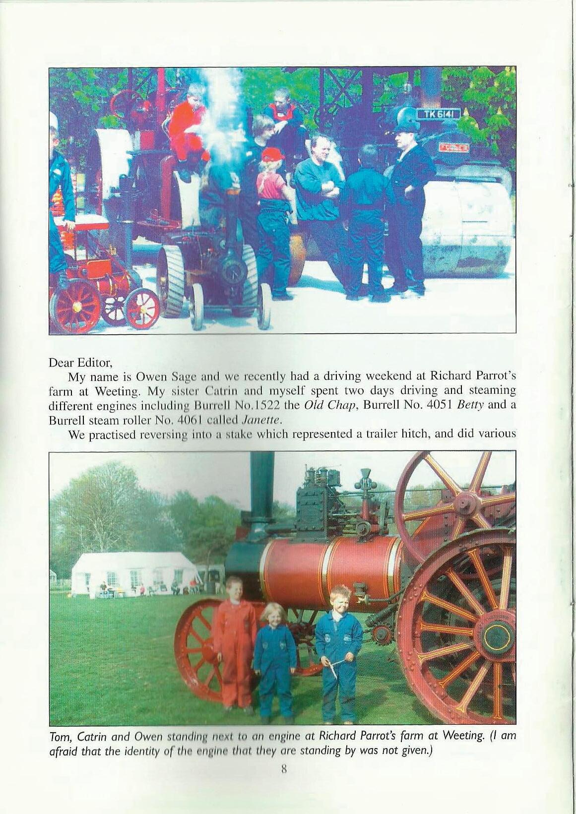 My name is Owen Sage nncl we rccenlly had a driving weekend at Richard Parrot's farm at Weeting. My sister C11t1fonncl myself spent two clays driving and steaming different eng.inesincluding llul'rdl No.1522 the Old Chap, Burrell No. 4051 Betty and a Burrell steam roller No. 4061 c•ulIt'd ./011elte.