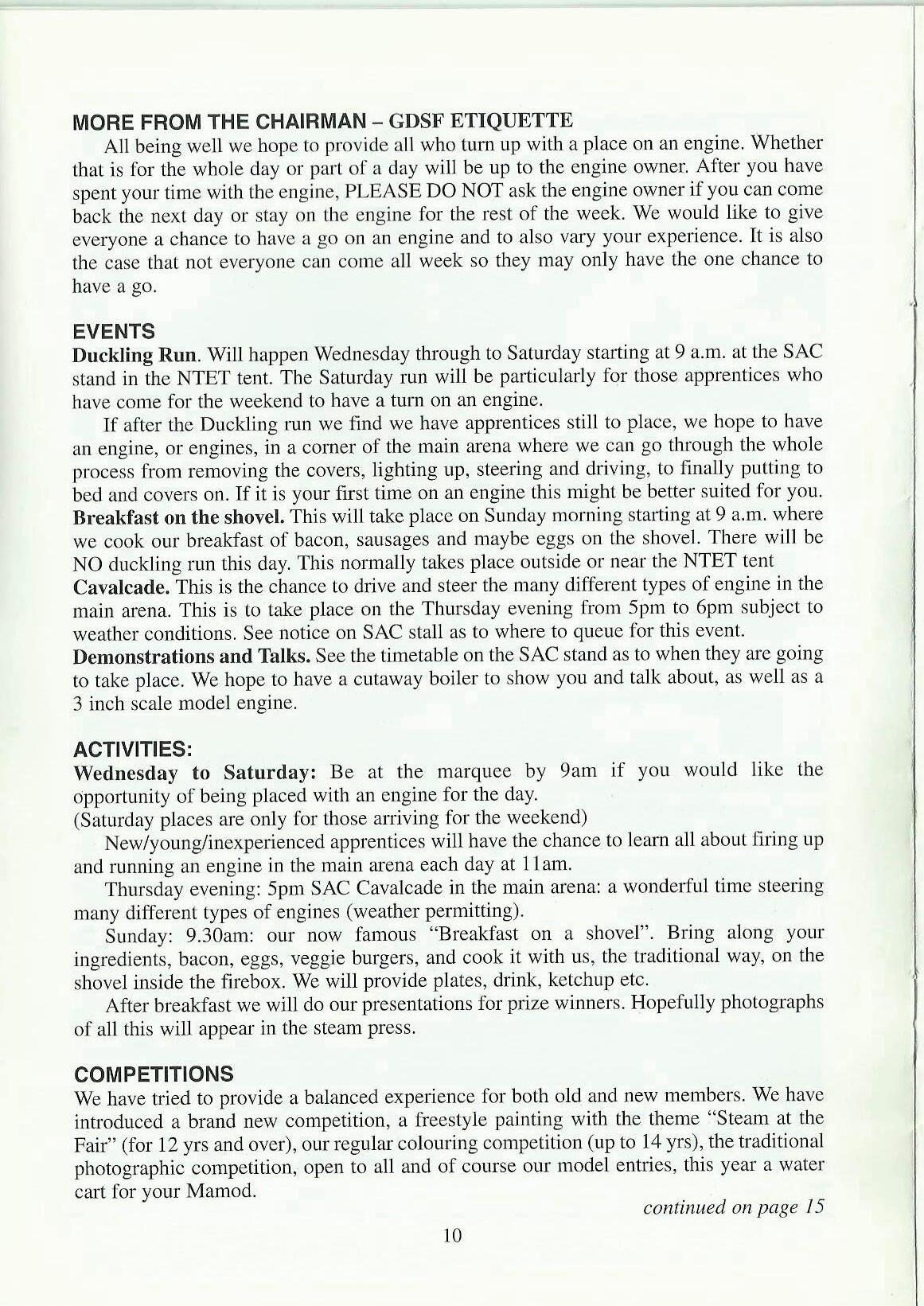 The big event of the year, The Grcut Dorset Steam Fair, will be just around the corner by the time you get this issue or th,.;11wgazine.Elsewhere in the magazine is a programme of what we hope to do and when. A daily event sheet wil1 be posted on the SAC stand in the NTET marquee, so check there for any changes or additions. For those of you who are regulars at GDSF you wiH lwvt,; 1H>ticcclwe have been experiencing increased difficulty in getting apprentices on engines. We would ask for your patience as we give 'first timers' first bite at the cherry.