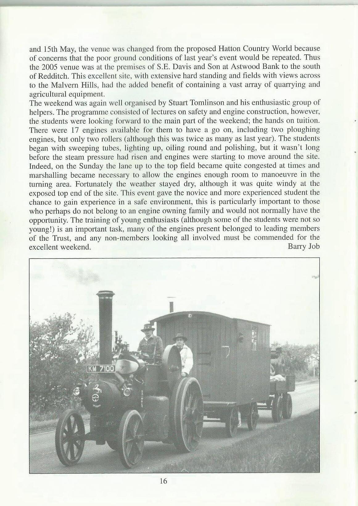 The weekend was again well organised by Stumt Tomlinson and his enthusiastic group of helpers. The programme consisted of lectures on safety and engine construction, however, the students were looking forward lo lhe main part of the weekend; the bands on tuition. There were 17 engines available for them to have a go on, including two ploughing engines, but only two rollers (alLhough this was twice as many as last year). The students began with sweeping tubes, lighting up, oiling round and poJjshing, but it wasn't long before the steam pressure had risen and engines were starting to move around the site. Indeed, on the Sunday the lane up to the top field became quite congested at times and marshalling became necessary to allow the engines enough room to manoeuvre in the turning area. Fortunately the weather stayed dry; although it was quite windy at the exposed top end of the site. This event gave the novice and more experienced student the chance to gain experience in a safe environment, this is particularly important to those who perhaps do not belong to an engine owning family and would not normally have the opportunity. The training of young enthusiasts (although some of the students were not so young!) is an important task, many of the engines present belonged to leading members of the Trust, and any non-members looking al] involved must be commended for the excellent weekend. BaiTy Job