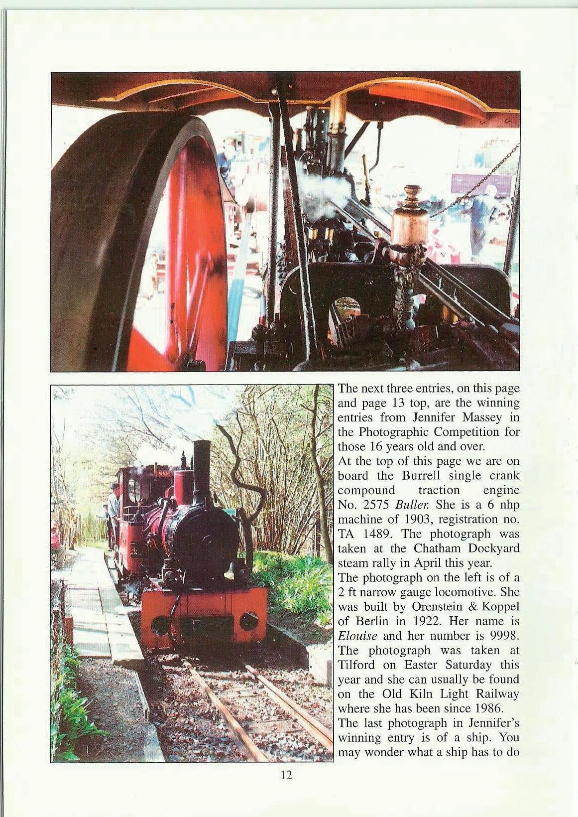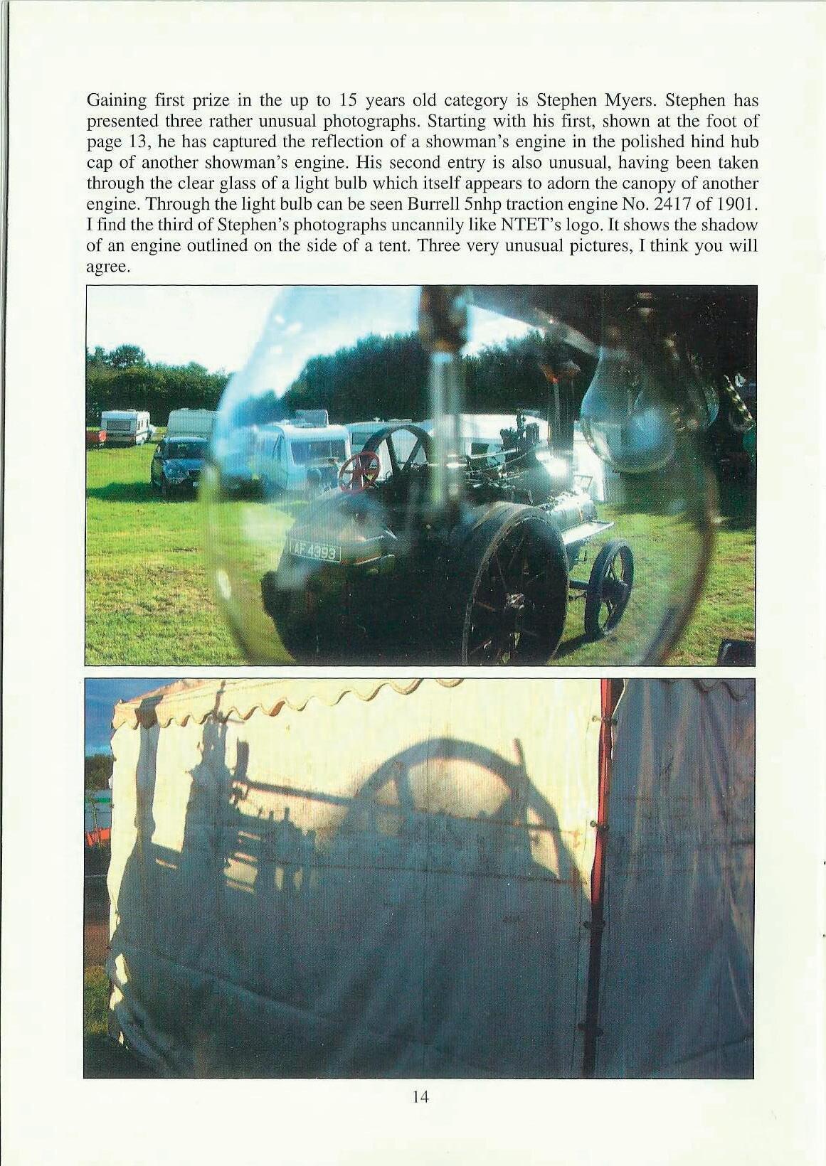 Gaining first p1ize in the up to 15 years old category is Stephen Myers. Stephen has presented three rather unusual photographs. Starting with his first, shown at the foot of page 13, he has captured the reflection of a showman's engine in the polished hind hub cap of another showman's engine. His second entry is also unusual, having been taken through the clear glass of a Jight bulb which itself appears to adorn the canopy of another engine. Through the light bulb can be seen BuITell 5nhp traction engine No. 2417 of 1901. I find the third of Stephen's photographs uncannily like NTET's logo. It shows the shadow of an engine outlined on the side of a tent. Three very unusual pictures, J think you will agree.