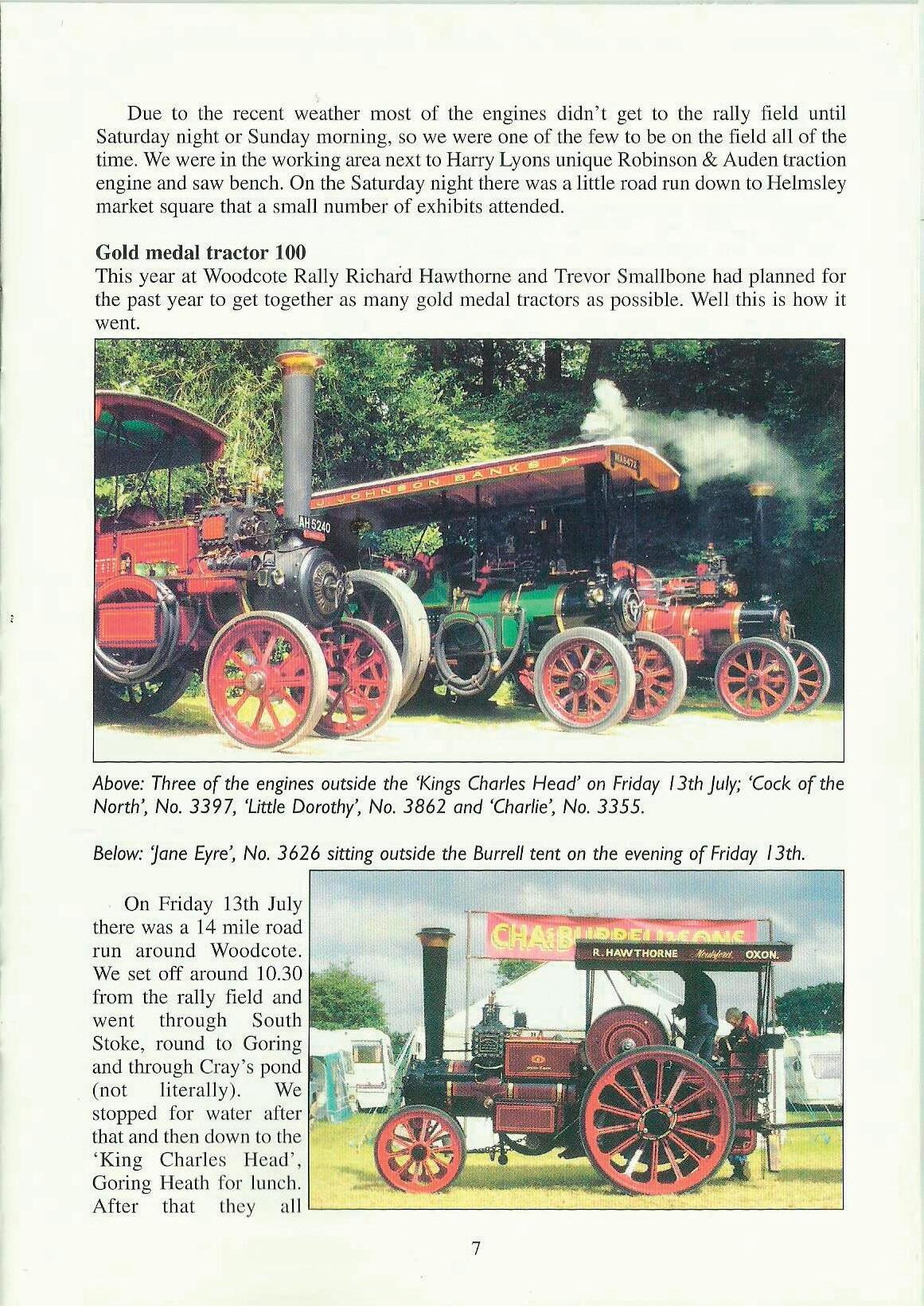 On the Saturday and Sunday there was the usual line up of engines and there was a special line up for gold medal tractors and a whistle for 'Charles Burrell and Sons'. On Sunday Jane Eyre, No. 3626, owned by Richard Hawthorne, my second cousin, son of Ran Hawthorne a founder of Woodcote Rally, was put on the blocks as it would have been when they were being sold new.