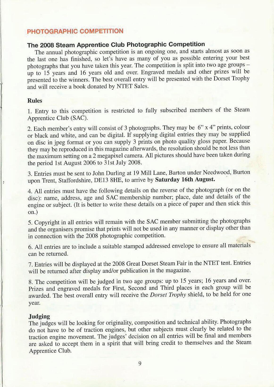 7. EntJ.ieswill be displayed at the 2008 Great Dorset Steam Fair in the NTET tent. Entries will be returned after display and/or publication in the magazine.