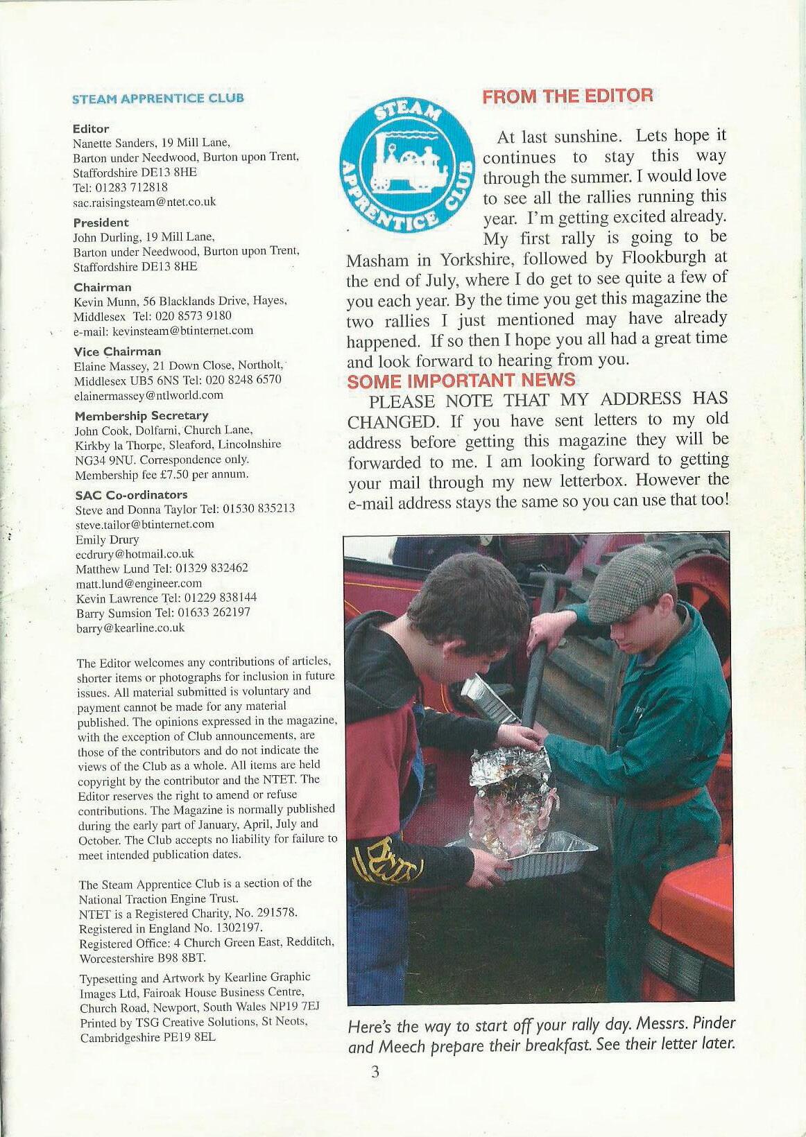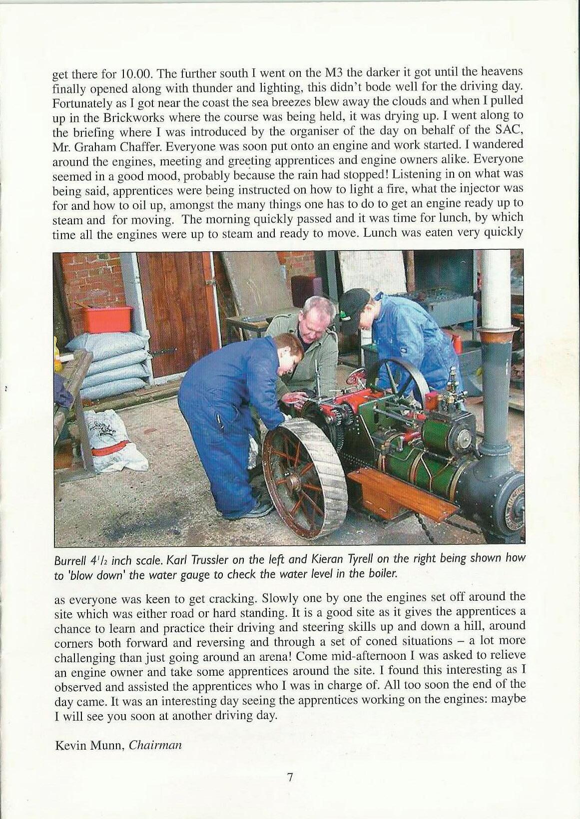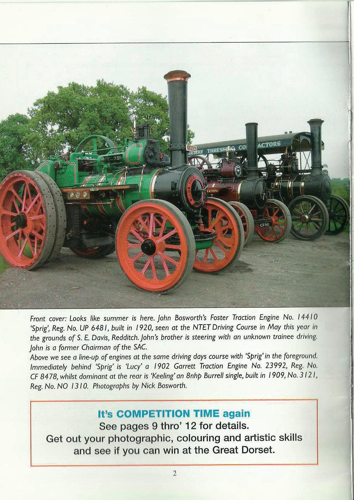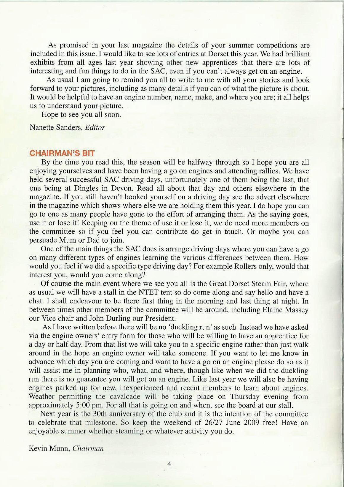 By the time you read this, the season will be halfway through so I hope you are all enjoying yourselves and have been having a go on engines and attending rallies. We have held several successful SAC driving days, unfortunatelyone of them being the last, that one being at Dingles in Devon. Read all about that day and others elsewhere in the magazine. If you still haven't booked yourself on a driving day see the advert elsewhere in the magazine which shows where else we are holding them this year. I do hope you can go to one as many people have gone to the effort of an-anging them. As the saying goes, use it or lose it! Keeping on the theme of use it or lose it, we do need more members on the committee so if you feel you can contribute do get in touch. Or maybe you can persuade Mum or Dad to join.
