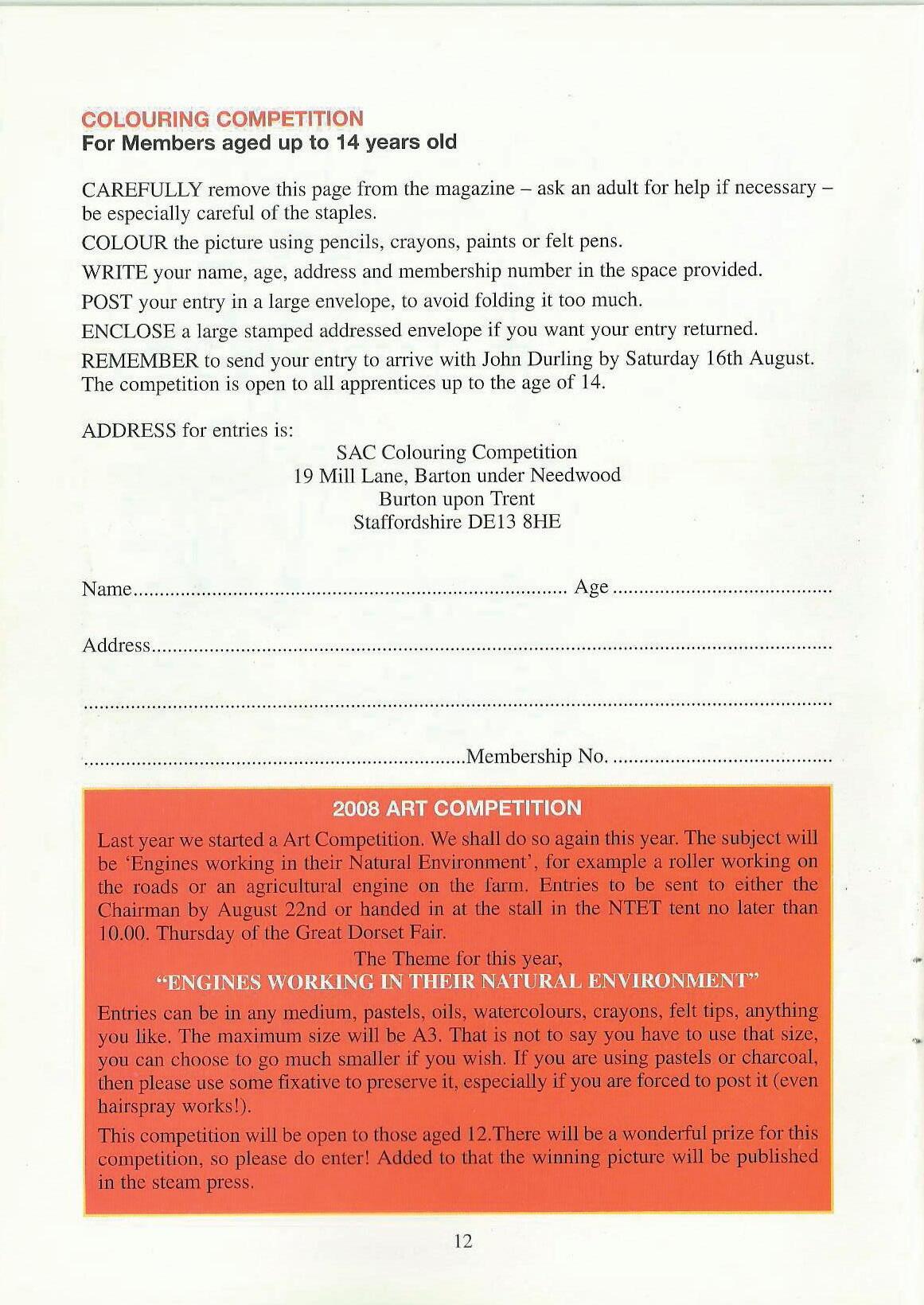 Lastyearwe starteda ArtCompetition.We shalldo so againthis year.The subjectwill be 'Enginesworkingin theirNaturalEnvironment',for examplea rollerworkingon the roads or an agriculturalengine on the farm. Entries to be sent to either the Chairmanby August 22nd or handedin at the stall in the NTET tent no later than 10.00. Thursdayof the GreatDorsetFair.