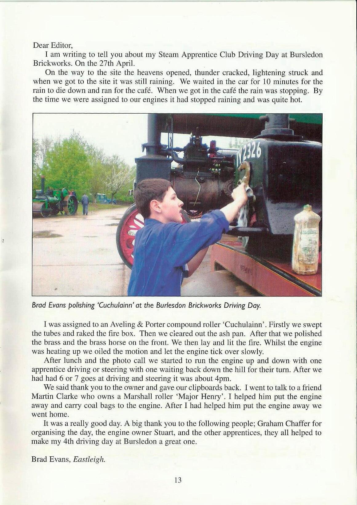 I am writing to tell you about my Steam Apprentice Club Driving Day at Bursledon Brickworks. On the 27th April.