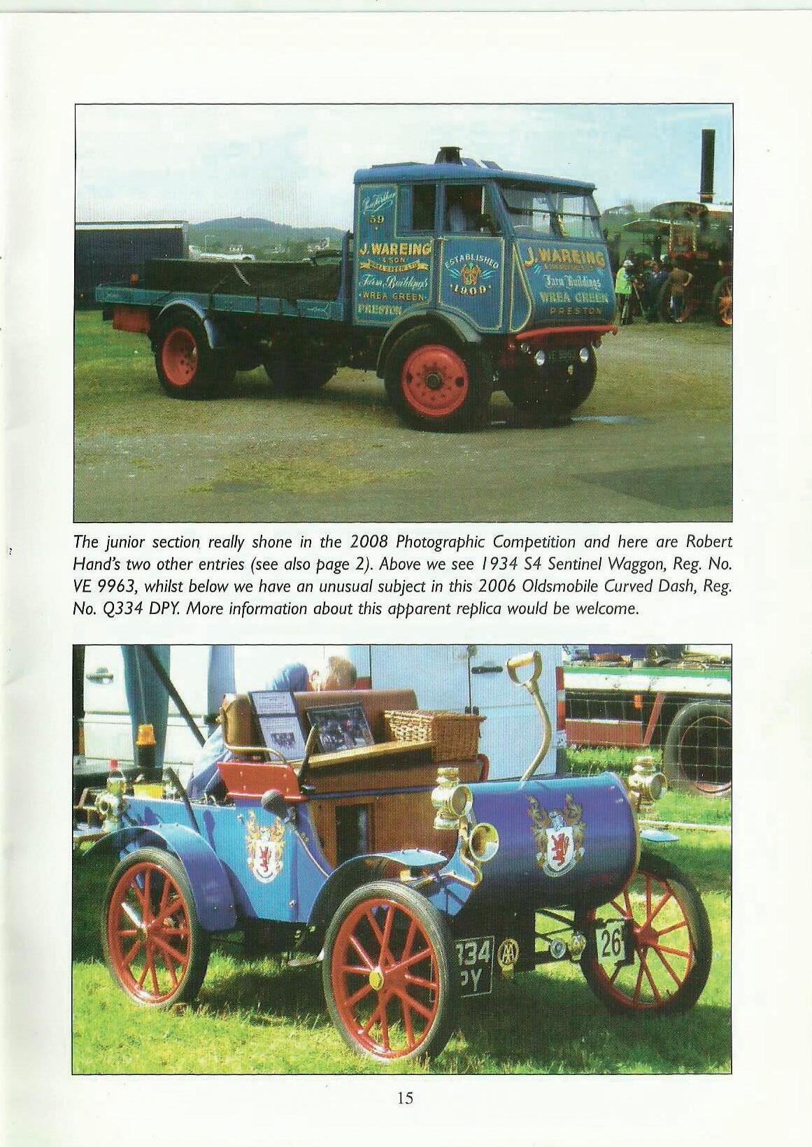 The junior section.reallyshone in the 2008 PhotographicCompetitionand here are Robert Hand'stwo other entries (see also page 2). Above we see I 934 S4 SentinelWaggon,Reg. No. VE 9963, whilstbelowwe have an unusualsubject in this 2006 OldsmobileCurvedDash, Reg. No. Q334 DPY.More informationabout this apparent replicawould be welcome.