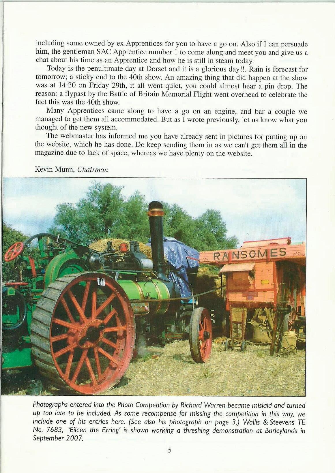 Photographsentered into the Photo Competition by Richard Warren became mislaid and turned up too late to be included. As some recompense for missing the competition in this way, we include one of his entries here. (See also his photograph on page 3.) Wallis & SteevensTE No. 7683, 'Eileen the Erring' is shown working a threshing demonstration at Barleylands in September 2 00 7.