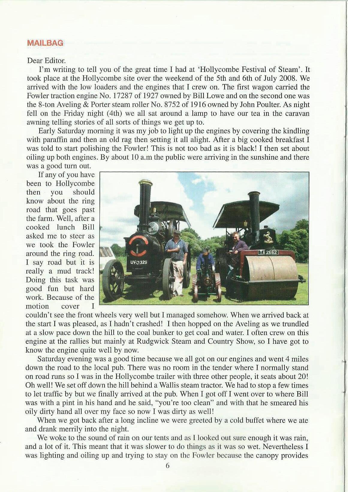I'm writing to tell you of the great time I had at 'Hollycombe Festival of Steam'. It took place at the Hollycombe site over the weekend of the 5th and 6th of July 2008. We anived with the low loaders and the engines that I crew on. The first wagon carried the Fowler traction engine No. 17287 of 1927 owned by Bill Lowe and on the second one was the 8-ton Aveling & Porter steam roller No. 8752 of J 916 owned by John Poulter. As night fell on the Friday night (4th) we all sat around a lamp to have our tea in the caravan awning telling stories of all sorts of things we get up to.