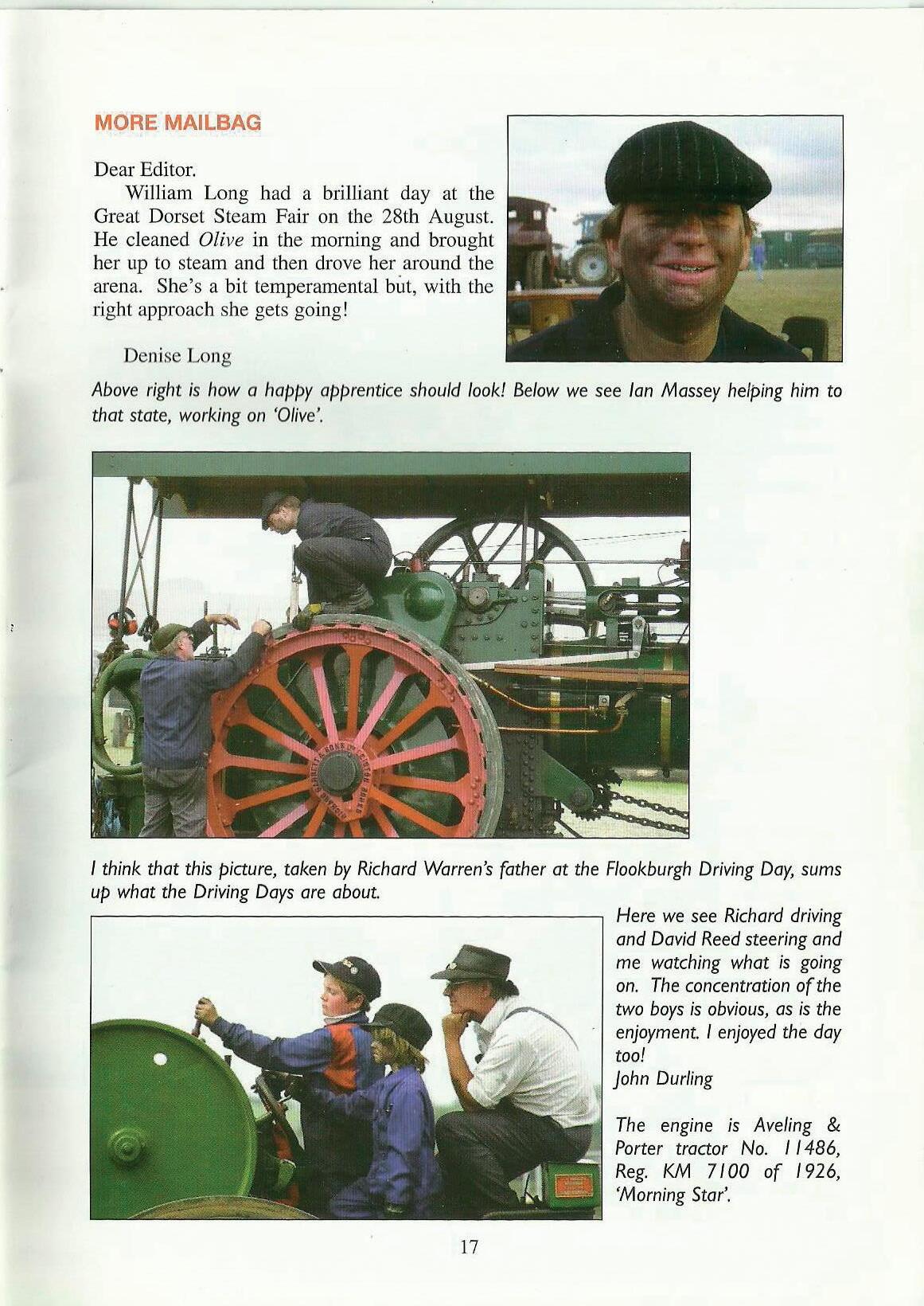 I have just returned from the Great Dorset Steam Fair after a fabulous week. I was pleased to see that all the bad weather we had just before the show seemed to hold off long enough for everyone to have a good time. Once again there were lots of entiies for the colouring, photographic and free art competitions. We were a little disappointed this year at the entries to the model competition. I would like your opinions on why we had so few entries. Were you all busy doing other things with your holidays? Did you find the instructions too hard/easy? Perhaps you just didn't fancy making the model this time. Whatever the reason it would still be nice to have your opinions. Next year's model is plmmed to be a fafrground organ, the plans will be in the Spring magazine. We have arranged for space in