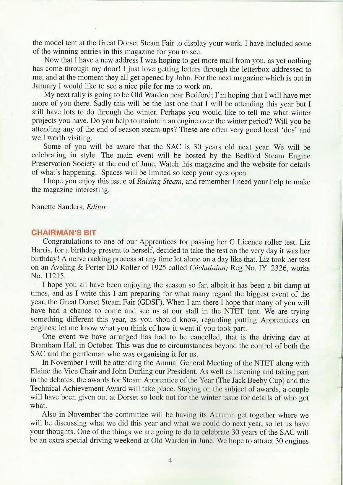 Some of you will be aware that the SAC is 30 years old next year. We will be celebrating in style. The main event will be hosted by the Bedford Steam Engine Preservation Society at the end of June. Watch this magazine and the website for details of what's happening. Spaces will be limited so keep your eyes open.