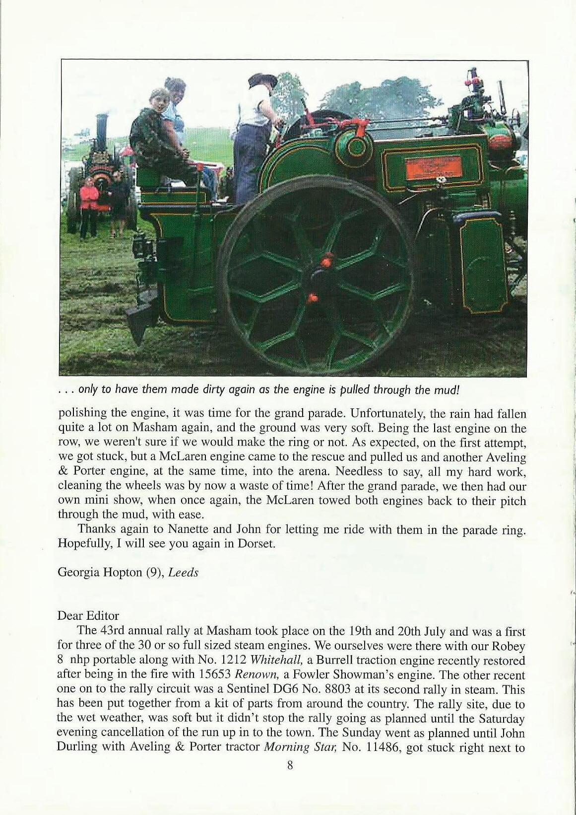 The 43rd annual rally at Masham took place on the 19th and 20th July and was a first for three of the 30 or so full sized steam engines. We ourselves were there with our Robey 8 nhp portable along with No. 1212 Whitehall, a Burrell traction engine recently restored after being in the fire with 15653 Renown, a Fowler Showman's engine. The other recent one on to the rally circuit was a Sentinel DG6 No. 8803 at its second rally in steam. This has been put together from a kit of parts from around the country. The rally site, due to the wet weather, was soft but it didn't stop the rally going as planned until the Saturday evening cancellation of the run up in to the town. The Sunday went as planned until John Durling with Aveling & Porter tractor Morning Star, No. 11486, got stuck right next to 8