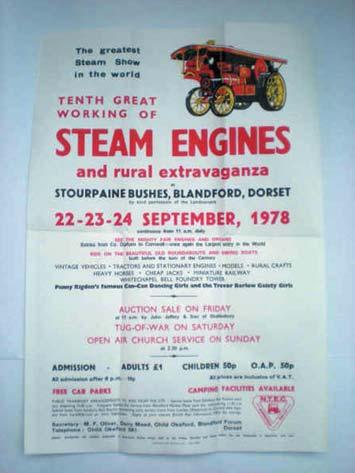 About 3 weeks ago I was at an Antique Fair in Winchester and came across what appeared to be an unopened envelope containing a mysterious object. This envelope was stamped with a 10th Anniversary THE GREAT WORKING OF STEAM ENGINES. Postmarked the 23rd September 1978 from Stourpaine Bushes, Blandford, Dorset. I wasn’t sure whether or not to open the envelope to see what was concealed inside. Eventually I did and to my delight it was an original ‘The Great Working of Steam Engines’ advertisement poster from 1978 –The 10th anniversary show.