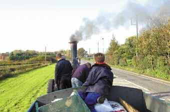 Once a ll c ou pl ed u p we set o ff – t ra c tion e ng i n e , wag on an d van. (S ee p hoto 3) . We ne eded two c rew, Keit h c ontr o l le d th e engi ne He was very go od at antic ipatin g c hang es i n the leve ls a lo n g the ro ad , u sin g th e en gine b rake and revers ing lever to de cele rate w hen we ha d to go down h ill s T he tr acti on engi ne clu nked and jolte d to ad just itself