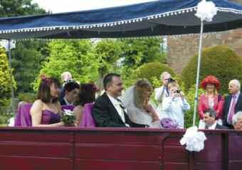 The 3 0 mi nu te s erv ice was re a l ly nic e a nd af te rwards we le ft the c hurc h and ye t m ore phot o s wer e taken o utsid e the chu rch. We were stoo d talking and chat t i ng for 20-30 m inu te s , d u rin g which ti me two different local new spapers inte rviewed t he b ri de and Len bef or e th e br ide, groom, t wo brid es maids and ME ! g ot on to the t raile r fo r t he ri de from t he ch ur ch to Blakel an ds Count ry House at Six A shes i n Bob bingto n whic h t o o k a p p r o x