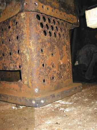 Removing the firebox took more effort than I thought it would. First I tried to knock it out by putting a metal drift in through the mudhole door opening and hitting the drift with a sledgehammer. It didn’t move at all! Though it did shake free all the scale and rust that had accumulated over the years! This indirectly saved me work as the scale and rust has to be removed so the boiler inspector can get a good look at the internal surfaces of the boiler. As I didn’t succeed by hitting, the other way is to jack it out. For this I made up a pulling tool, see my little sketch for details of how this worked. One end of the fixture I put into the slots which I had cut out in the fire box. The other end hangs free on long studding.