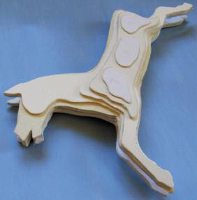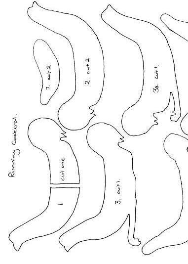 Start by drawing the pieces onto your card, number them and cut them out. The more carefully you do this the less hard the sandpapering will be. When you have all the pieces cut out, start to glue them together beginning with the central piece. DONāT FORGET to cut out the channel for the stick. When your horse is assembled and you are happy with it, leave it to dry overnight before you start to shape it.