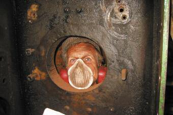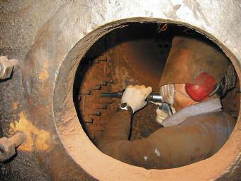 Inside the boiler using a needle gun to remove scale and corrosion.