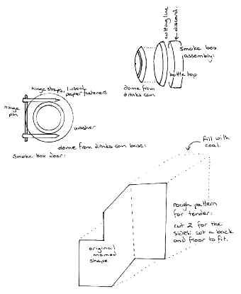 Smoke box door assembly: this is a bit more complex but the effort put in is well worth it. Start with the metal top of a sauce bottle. (I have used a plastic top from a herb jar, but wont steam it with this attached) You only need the upper half (see diagrams). You will also need a soft drink can or similar. Carefully cut out the base where the metal is domed The centre of this will make the curved smoke box door Glue it onto the bottle top, and paint the assembly black with enamel. Then add whatever lettering you want, mine said ‘MAMOD STEAM TRACTOR’ in a ring a bit like a Burrell. To be really clever, add clock hands made from small pieces of brass or even cocktail sticks painted gold