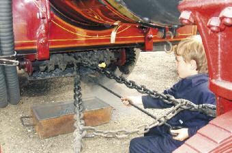Meanwh il e, El iz ab eth was g iven the j ob of cl eani ng the paint wor k o f the Fode n bus w hile steam was ra ise d. Mum he lp fu lly tol d h e r wh ere sh e’d miss ed a bit. The n i t was El izabeth ’s t ur n t o be sh own how th e bus operated and get to g ri ps with the regula tor Sh e had a gr eat tim e dr iv ing an d be in g a passeng er on it - t hey rang th e bell lots of t i mes!