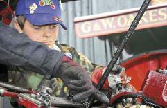 Jamie Laister and George Ric hards helping Les Searle c lean the tubes on his engine .