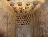 Next came the fitting of the box. As you can see from the accompanying photos they do it all upside down for ease of access and handling using gravity to help them do the work.The new box with foundation ring is lowered into the boiler into the correct position and bolted into place. The rivets are then heated to red hot and put into place and squeezed down so that they are firmly held in place.