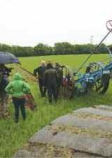 for the bikers’ appearance The film crew arrived rather early too, setting up their long arm camera for distance filming and setting Robert up with a mic – all getting a bit professional! We had a few practice pulls with the plough and cameras, then the bikers arrived and introduced themselves. We all had a bit of a laugh about the conditions and the now ever persistent rain! Filming began to get under way with Robert enjoying being the centre of attention, while Basil and I, the engine drivers tried to keep out of the way! Si had the first go at steering the plough and after a bit of fuss did ok, at least the plough stayed in the furrow! Next it was Dave’s turn. This did not go so well, as he ended up with a rather ‘S’ shaped furrow which missed a lot of land out! But then steering is the wrong way I guess, and I’m pretty sure he couldn’t see anything out of his glasses because of the very heavy rain by that point! Perhaps we should let him off a bit! After this they all had their lunch. Apparently it tasted better than it looked, but I’ll take their word for that They had a chat with Robert and some more repeat filming was done. This got rather dull after a while –there’s only so many times you can laugh at the same joke on film!