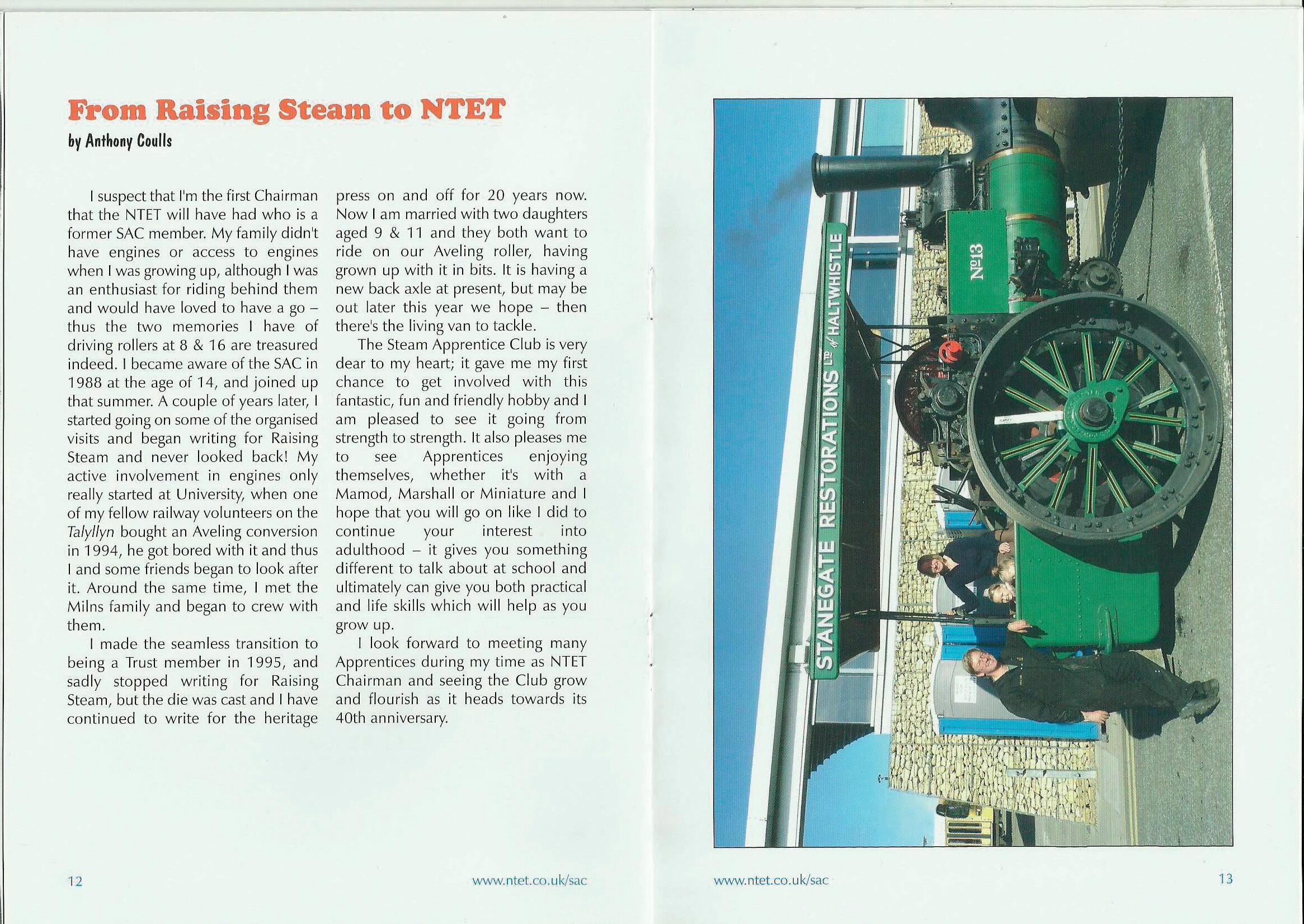 I suspect that I'm the first Chairman that the NTET will have had who is a former SAC member. My family didn't have engines or access to engines when I was growing up, although I was an enthusiast for riding behind them and would have loved to have a gothus the two memories I have of driving rollers at 8 & 16 are treasured indeed. I became aware of the SAC in 1988 at the age of 14, and joined up that summer. A couple of years later, I started going on some of the organised visits and began writing for Raising Steam and never looked back! My active involvement in engines only really started at University; when one of my fellow railway volunteers on the Talyllyn bought an Aveling conversion in 1994, he got bored with it and thus I and some friends began to look after it. Around the same time, I met the Milns family and began to crew with them.