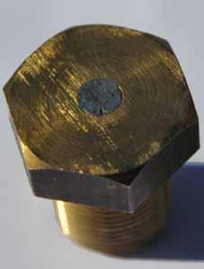 Figure 3 shows a typical fusible plug in more detail. It is a brass bolt that has been drilled though the centre, and then a screw thread cut using a tap and the hole then filled with lead; you can see the grey lead in the centre of the brass
