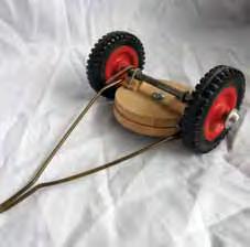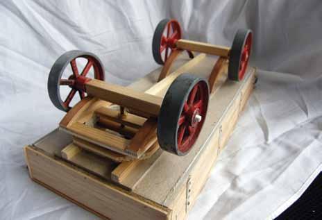 Cut two strong circles about 2.5ins (6cm) diameter (or four of mountboard and glue in pairs). These will form a simple turntable for your front wheels. Put a small nut and bolt or other fixing through the centre to allow them to turn. It is a good idea to put a piece of tracing paper, greaseproof, or even a bit of Vaseline between to ensure it turns easily. Attach two small blocks to the underside and fix your wheels and axle to them. Mount this at the front of your trailer on blocks to give your wheels enough clearance.