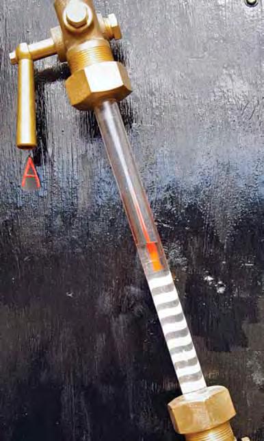 Figure 4 shows the water gauge demonstrator with water – the red line helps the level to be seen easier (some engines use black & white stripes). The cocks fitted to the top and bottom of the gauge allow the ‘blowing down’ to clear and check that it works correctly, as well as isolating the gauge if the glass breaks.