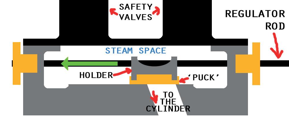 When the regulator is closed the puck covers the steam passage to the cylinder, but when you open the regulator (in the direction of the green arrow) the holder moves the puck away from the hole, letting steam through into the cylinder.