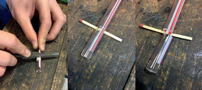 were too long for the engine (they are the glass tubes from the DCC/Showmans, which are longer), so we had to shorten it. This is actually easy to do as shown in picture 2. You have to work out the length required; the glass has to fit into both the bottom and top block, to allow the seals to work, but not too long to block the top steam passage. Wrap a piece of masking tape and mark the length required; then using a triangular file score a notch in the glass. To break the tube, place the notch on a match stick, and then a quick press with the flat of your hands either side causes the glass to cleanly break.