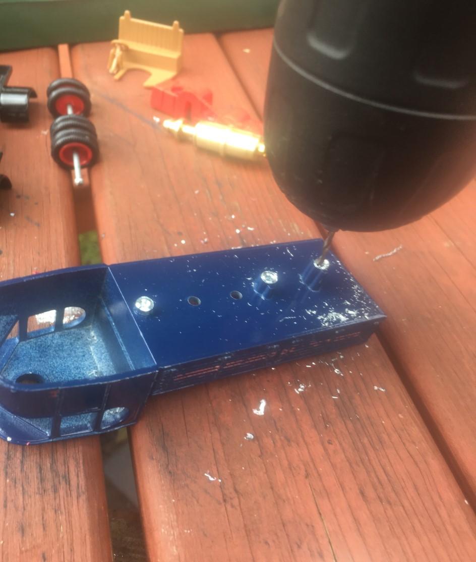 these rivets to allow the body to separate from the chassis. Using the 4mm Drill Bit in the handheld drill, gently drill down to remove the edges of the posts. There is no need to apply any pressure as the diecast metal is quite soft. Make sure you wear safety goggles when drilling. Once you have removed the edges the chassis should be loose from the body. You might find a flat headed screwdriver useful for prying them apart. This will allow the wheels, boiler and cab interior to be removed.