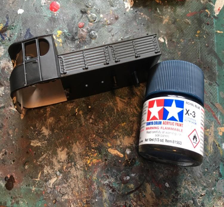 For brush painting I prefer to use acrylic modelling paints such as Tamiya or Citadel as these dry quickly and have good coverage. You will find they come in a large range of colours, and in gloss and matte varieties. The colours you choose is up to you! My advice would be to choose a deep gloss colour such as dark green, blue, or maroon for the body, and pick out the interior and load bed in lighter matte colours. I have chosen to paint the cab interior a light tan, the load bed and cab seats a flat brown, the roof and boiler matte black, and the cab, body and mudguards a deep gloss blue. I have also picked out the steering wheel in a gloss red. Usually the different painted areas will need two coats, leaving an hour or so between coats to let them dry.
